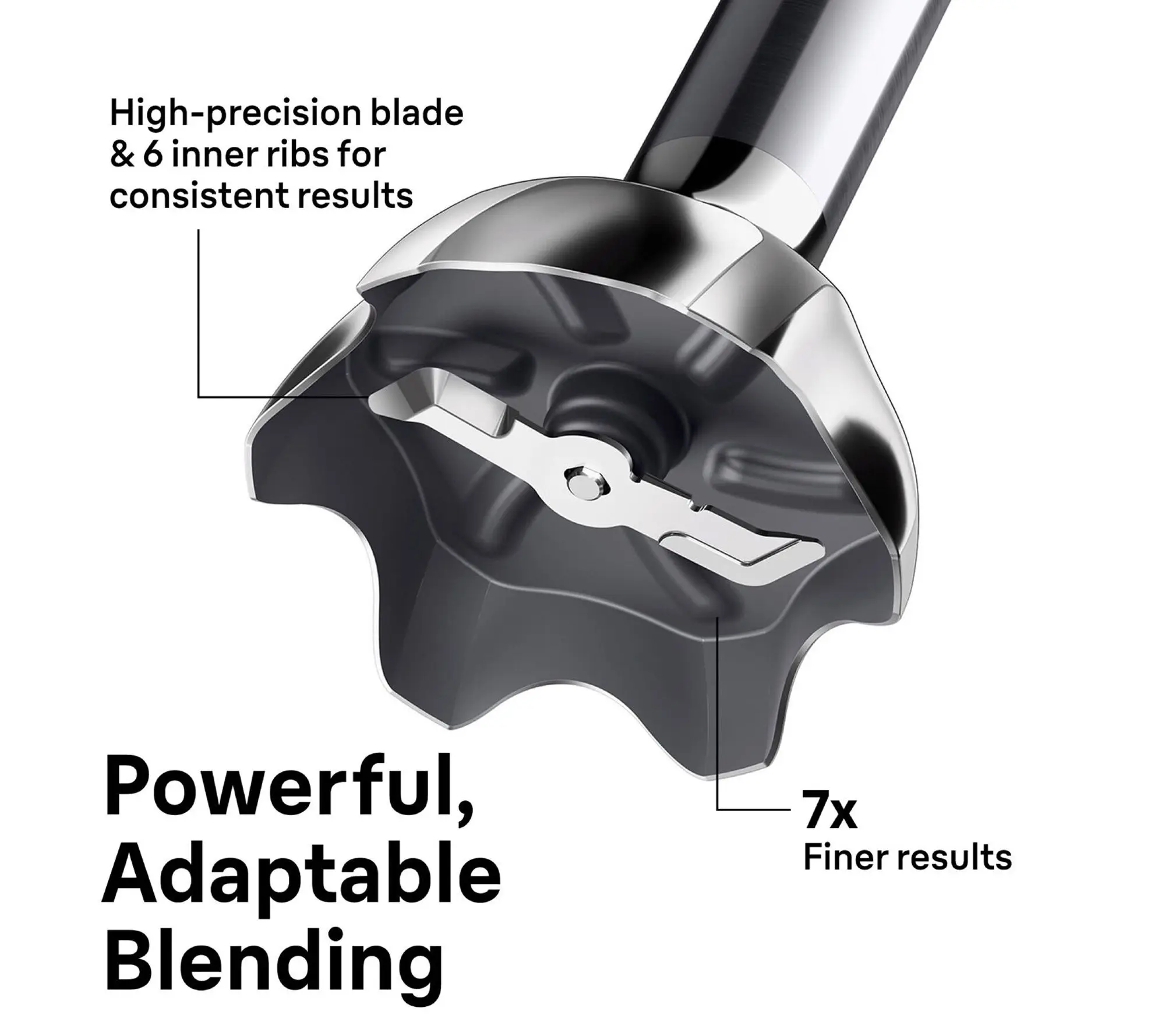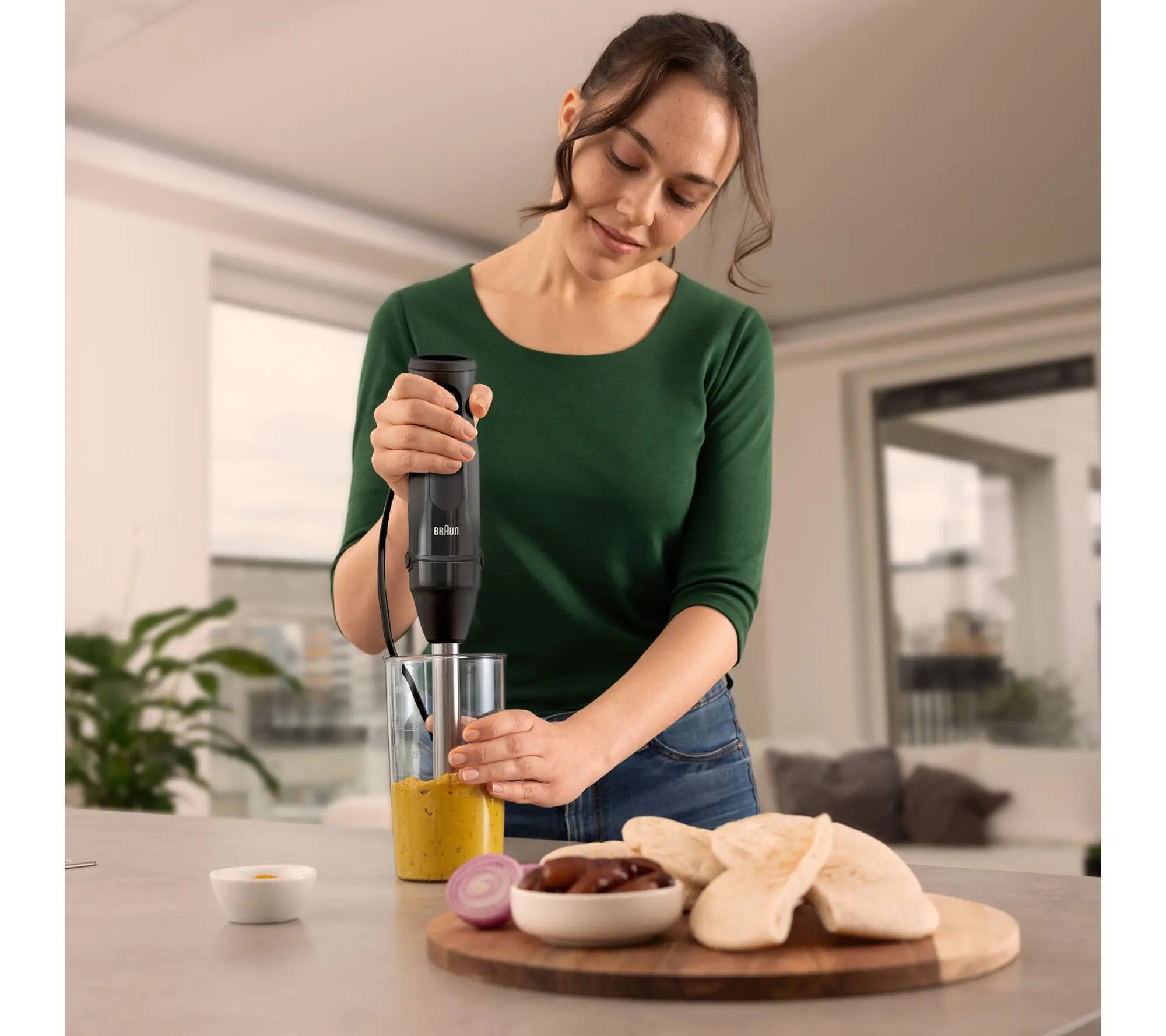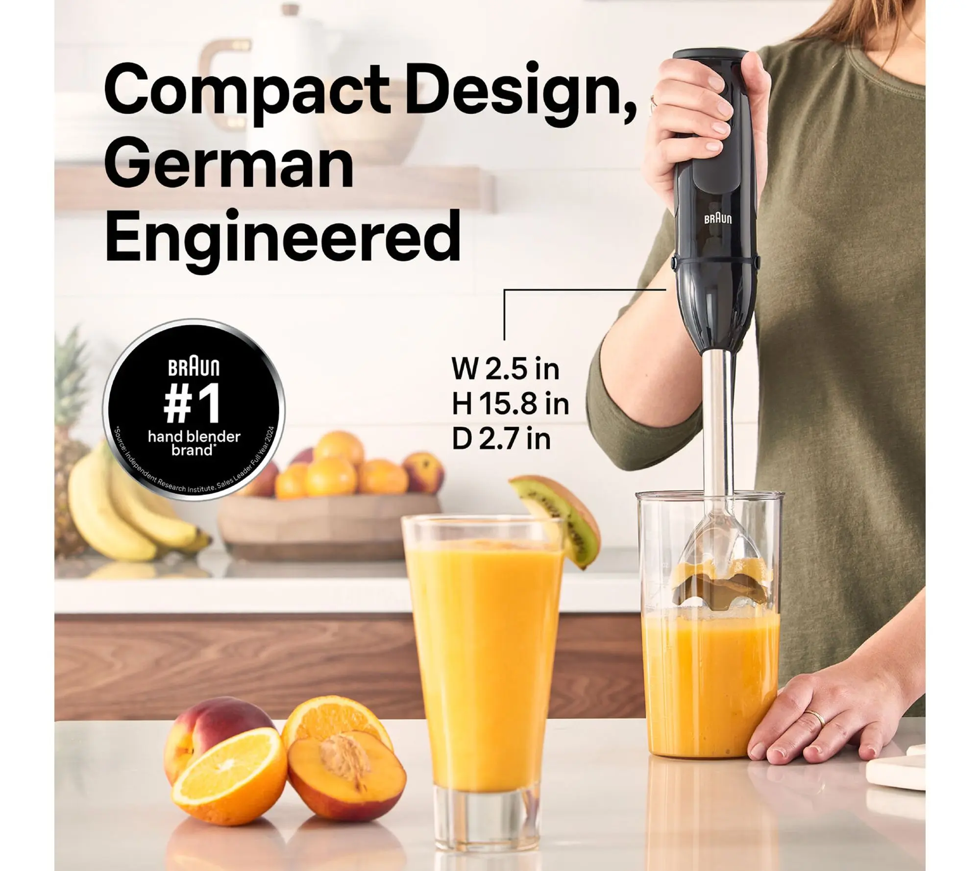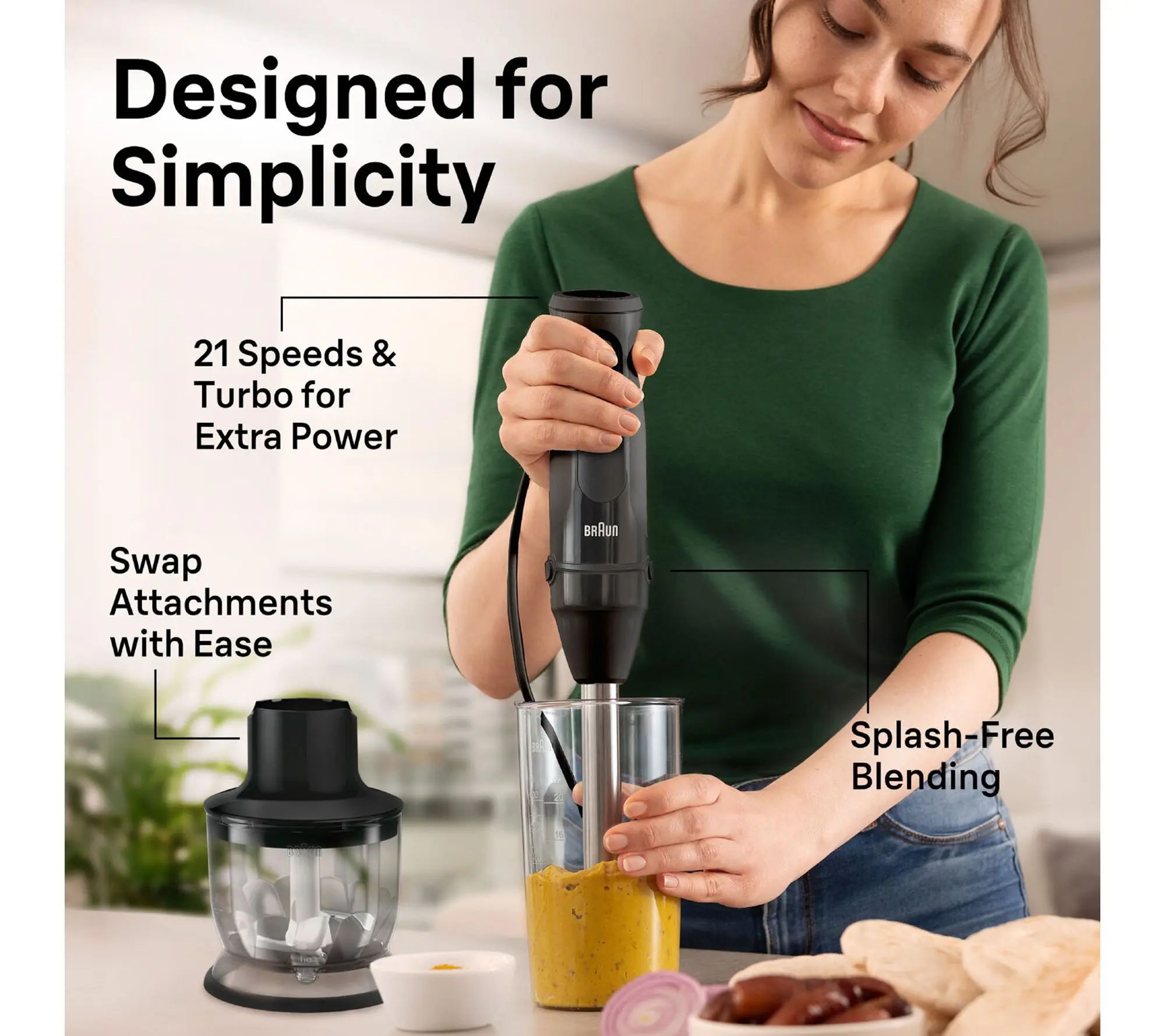 Effortlessly whip up silky smoothies, homemade soups, or dressings with this hand blender, designed to keep splatters in check while staying comfortable to hold. Twenty-one speed settings and a bell-shaped shaft give you fine control for blending, whisking, and chopping, whether in a pot or a plastic beaker. Make prep easier and cleanup simpler for everyday meals and creative recipes alike. From Braun.