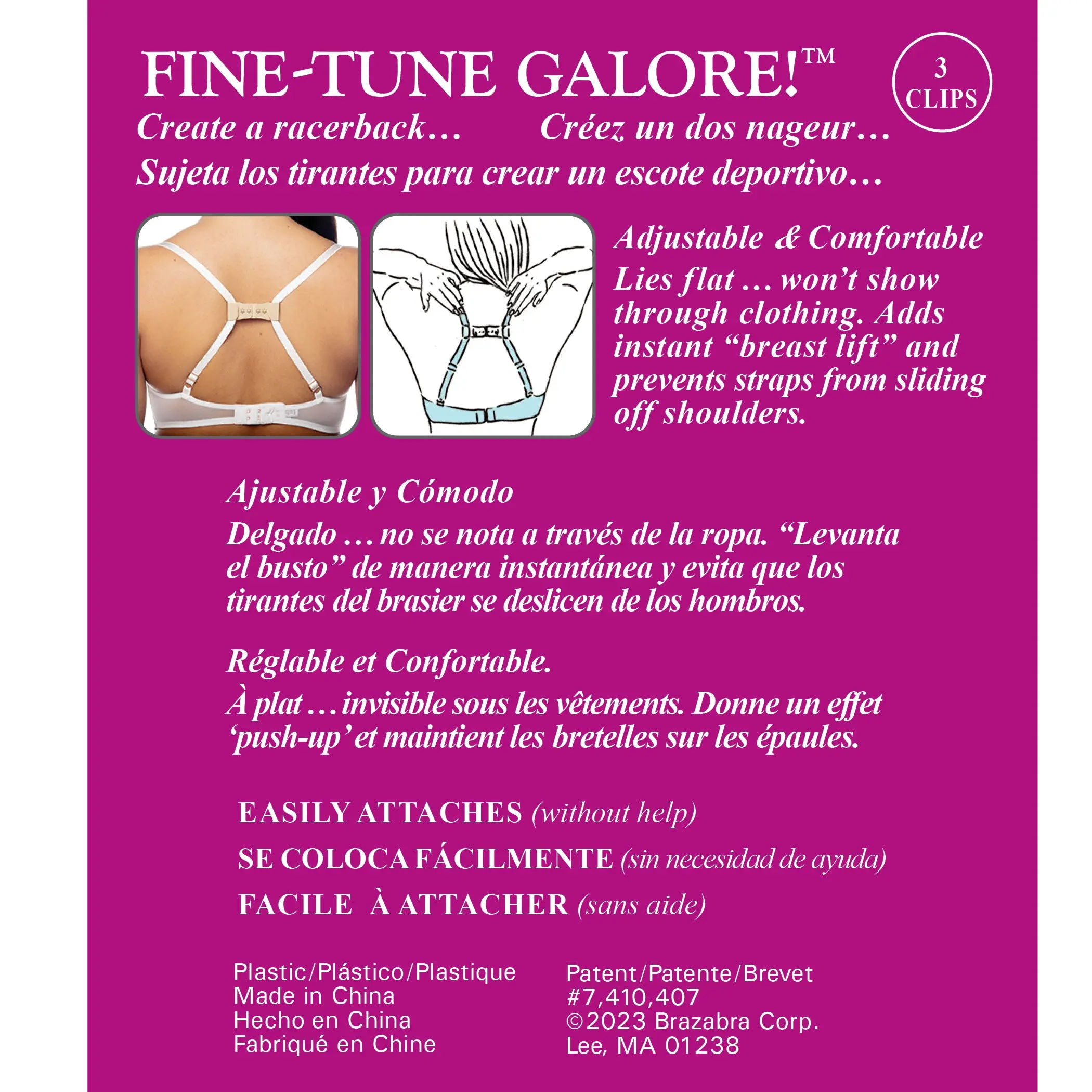 This adjustable bra clip instantly converts any bra into a racerback style, providing lift, support, and cleavage. Now available in 3 colors at no extra charge! It's incredibly comfortable, won't show through clothing, and can be easily attached to straps without assistance. Plus, it's adjustable and lies flat for a seamless look.