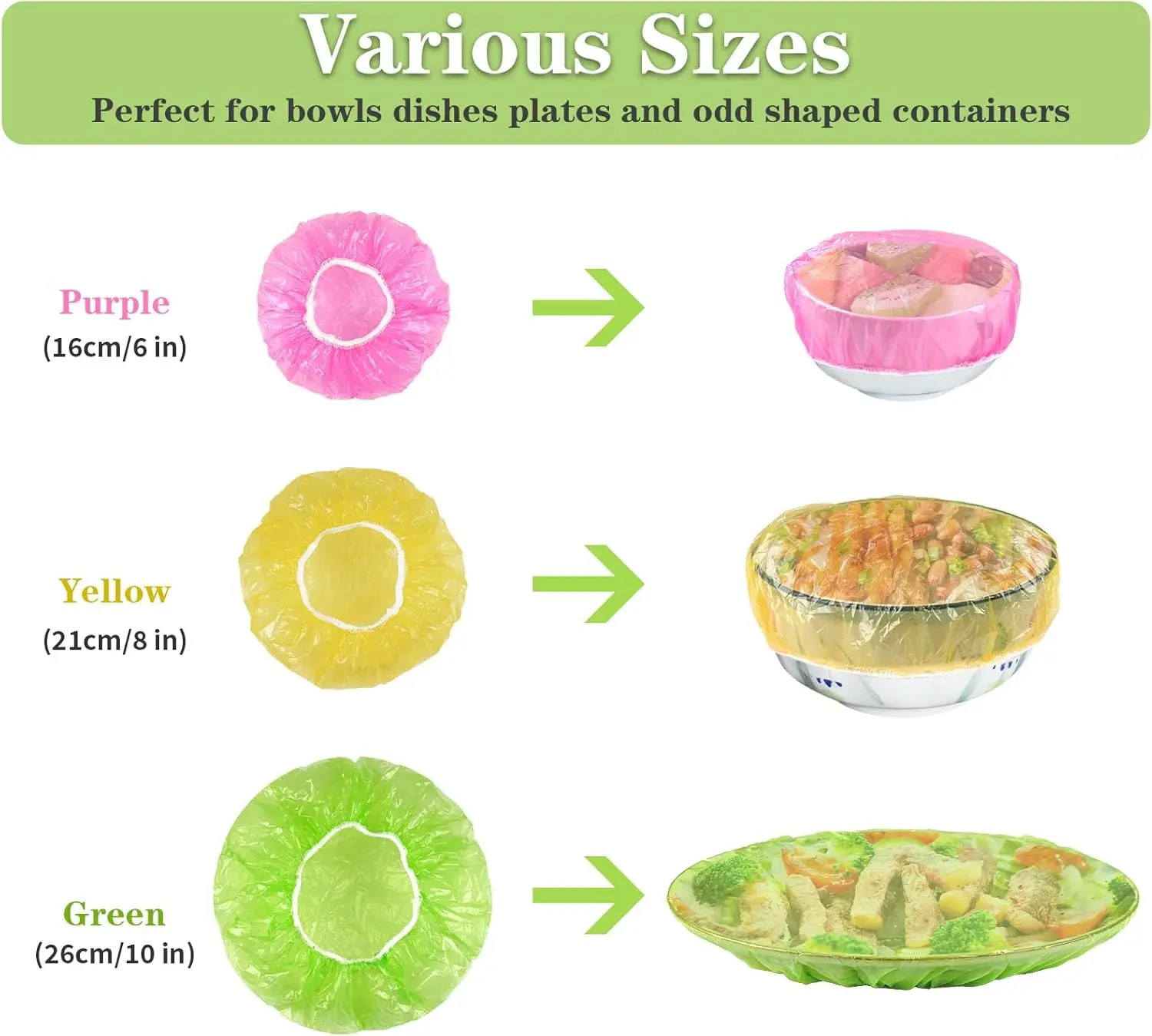 ·3 Size Bowl Covers: 6 inches-20 pieces purple; 8 inches -20 pieces yellow; 10 inches- 20 pieces green 60 pieces in total; Various size bowl covers are suitable for bowls, dishes, plates