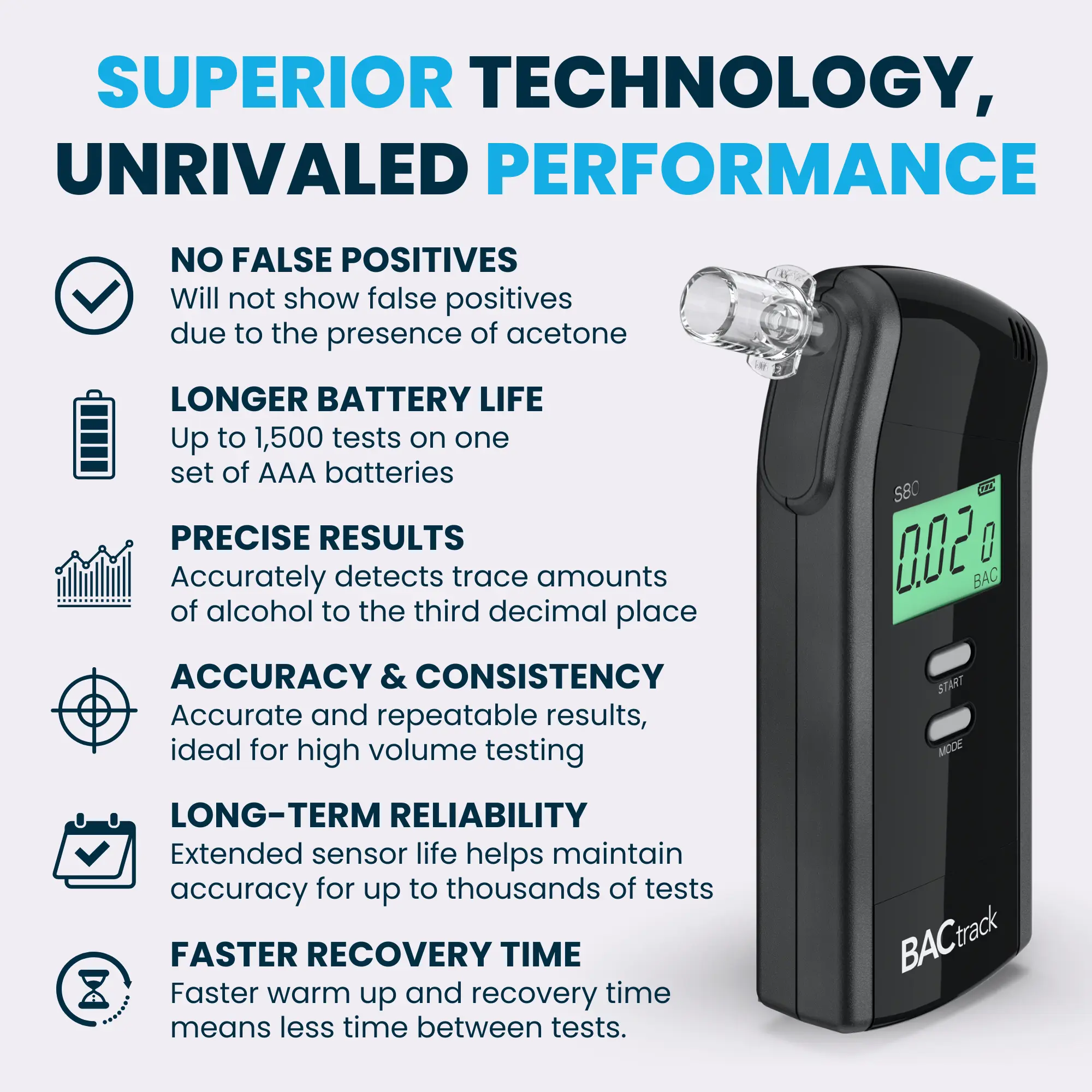 ·PROFESSIONAL-GRADE ACCURACY - Powered by BACtrack's largest platinum-based Xtend Fuel Cell Sensor, the S80 utilizes the same pro-grade technology trusted by hospitals, clinics, and even law enforcement.