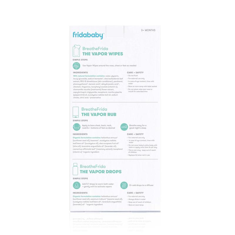 Baby all stuffed up? The Breathe Easy Kit has everything you need to rid your little ones nose of boogers, mucus and snot. BreatheFrida Vapor Wipes clean up boogies on-the-go, while the organic Vapor Rub is no  mess chest balm to help baby breathe easy. Plus the organic Vapor Drops soothe with natural essential oils that are safe for sensitive skin.