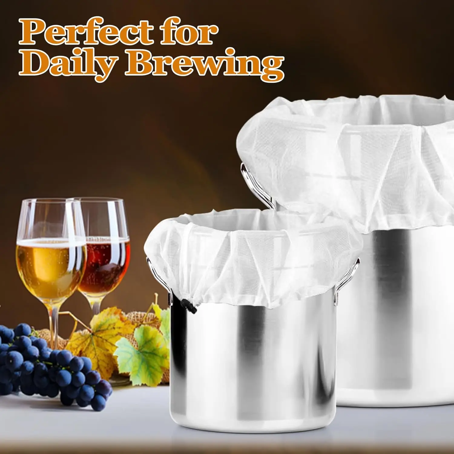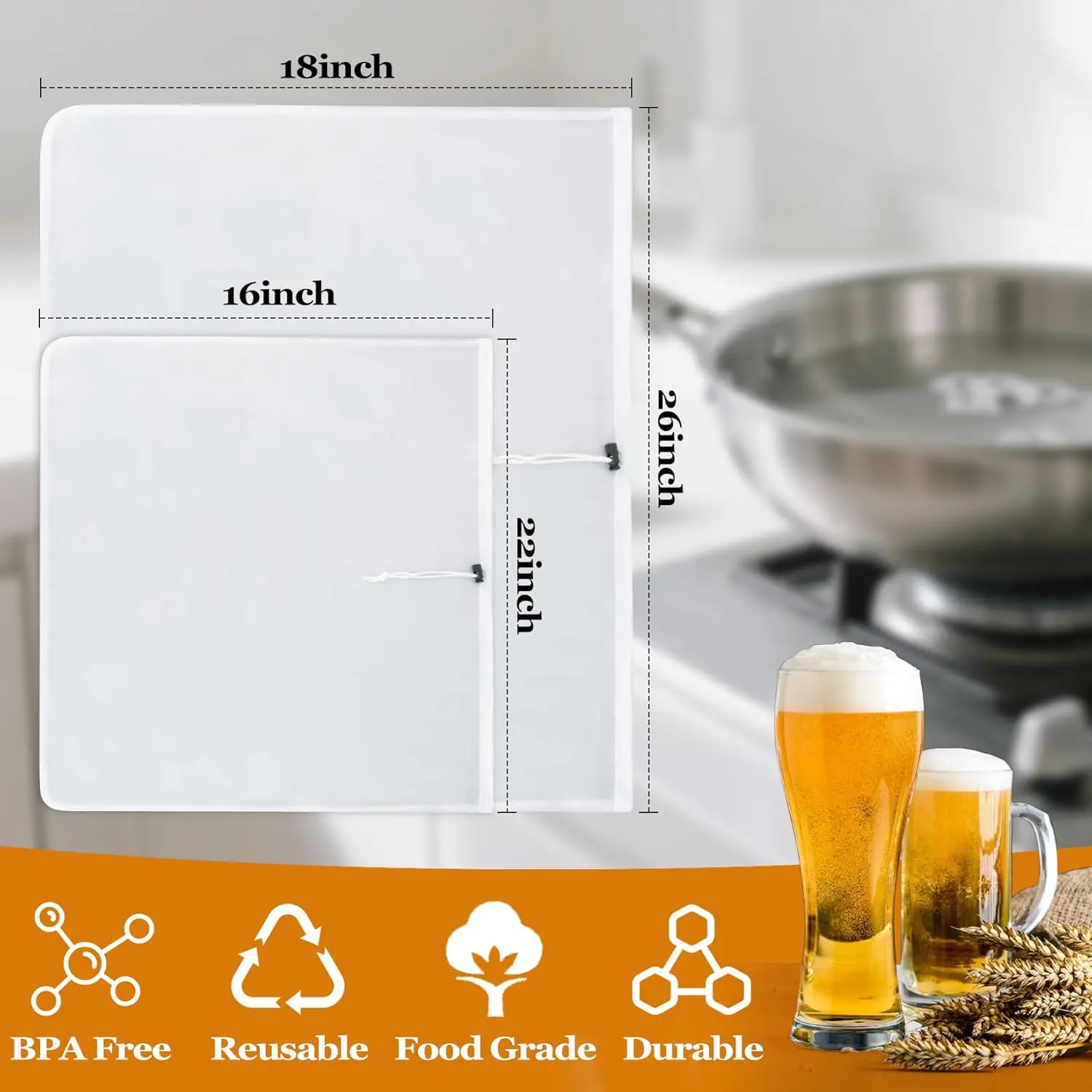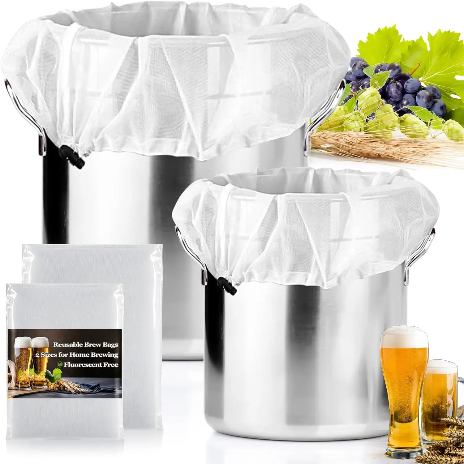 & Medium: These strainer bags come in 2 sizes. The one (26x22 inches) fits kettles up to 17" in diameter and holds 20 lbs of grain, and the medium (16x18 inches) holds 15 lbs, offers a simple and effective option for brewers