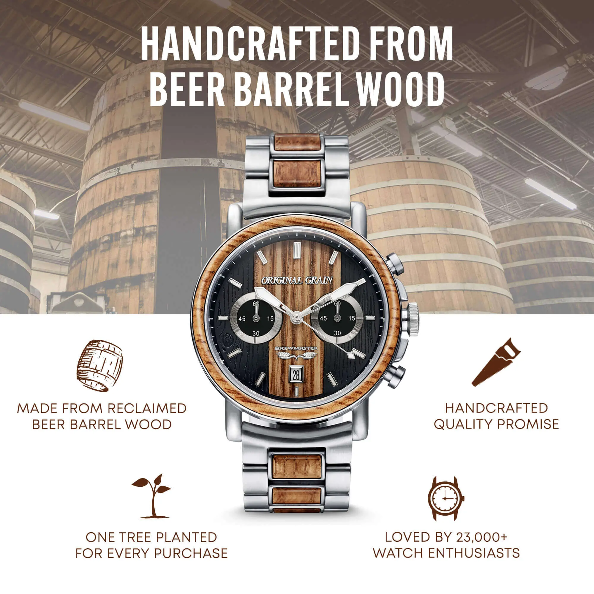 Watch is made with great quality and care. Has a great feel and weight to it. Love the way it looks and absolutely love the recycled oak beer barrel it was made with.