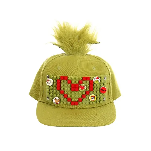 A Grinch With Good ReasonWe think one reason the Grinch is so grouchy is that people only think about him around Christmas. Well, we all know how much the Grinch hates Christmas. Now, you can make the Grinch a part of your everyday apparel when you grab this Bricky Block Build-On Snapback Hat.Product DesignNot only is it a hat, but it's also a kit. It comes with a hat, 102 blocks, and 6 stickers. Make a multitude of different designs on the brick base panel at the front of the hat. You can create a design that resembles the Grinch’s yellow eyes. You can also make the Grinch’s heart that grew three times in size. Create a whole new design with your imagination and the pieces provided. The color of the snapback matches the color of the Grinch’s green skin and hair. At the top of the hat, there is also a green tuft of faux hair. A plastic size adjustment band is at the back of the hat that should allow this accessory to fit just about anyone’s head.Year of the GrinchThis officially licensed Dr. Seuss-themed snapback is the perfect accessory for every fan of the Grinch. Make this iconic character relevant all year round!