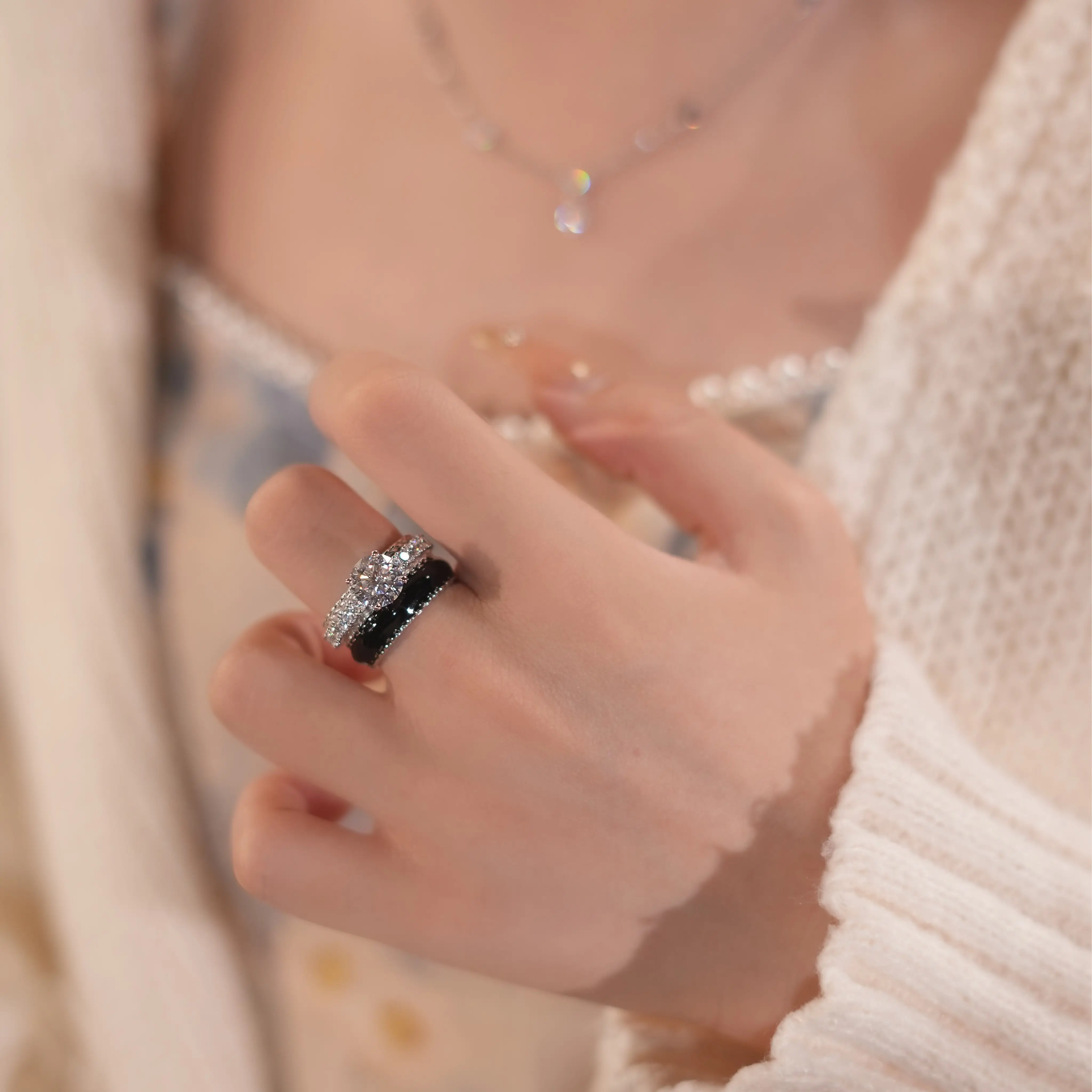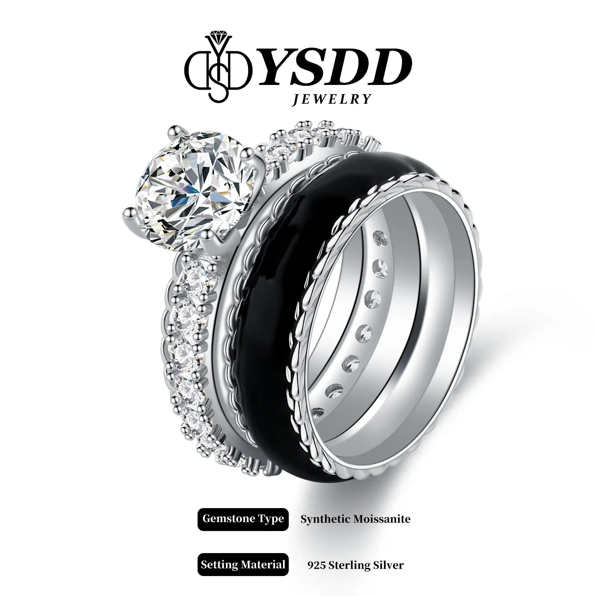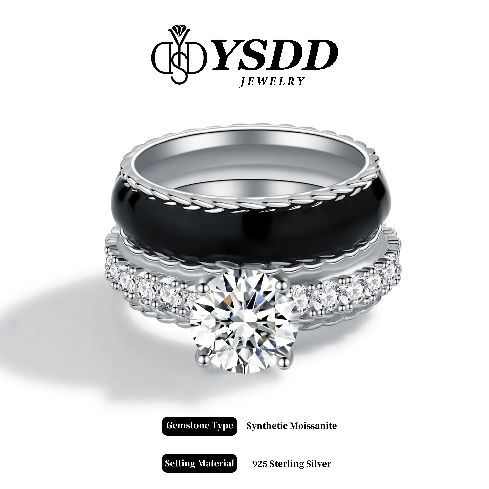 ·Thick enamel silver ring, 10.5mm total. One part silvery tone, one part enamel round. The silvery tone features a 2ct synthetic moissanite stone, with a clarity of VVS1-2 and D/E color, its circle band covered by 5AAAAA CZ, shining at 360 angels. Full of stones setting, but won't scratch your skins while daily working.