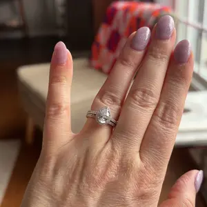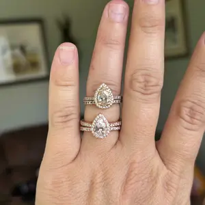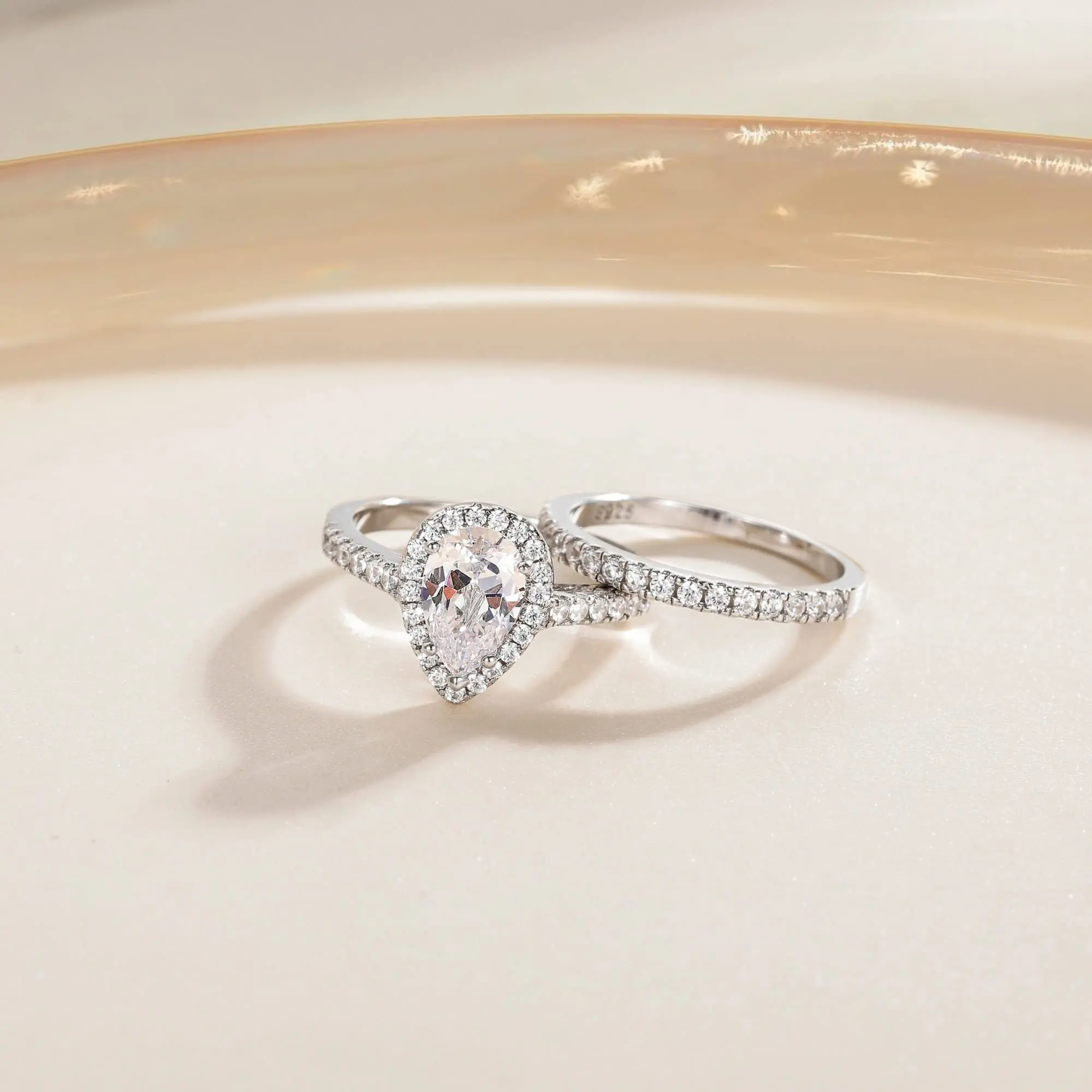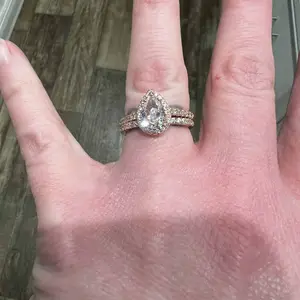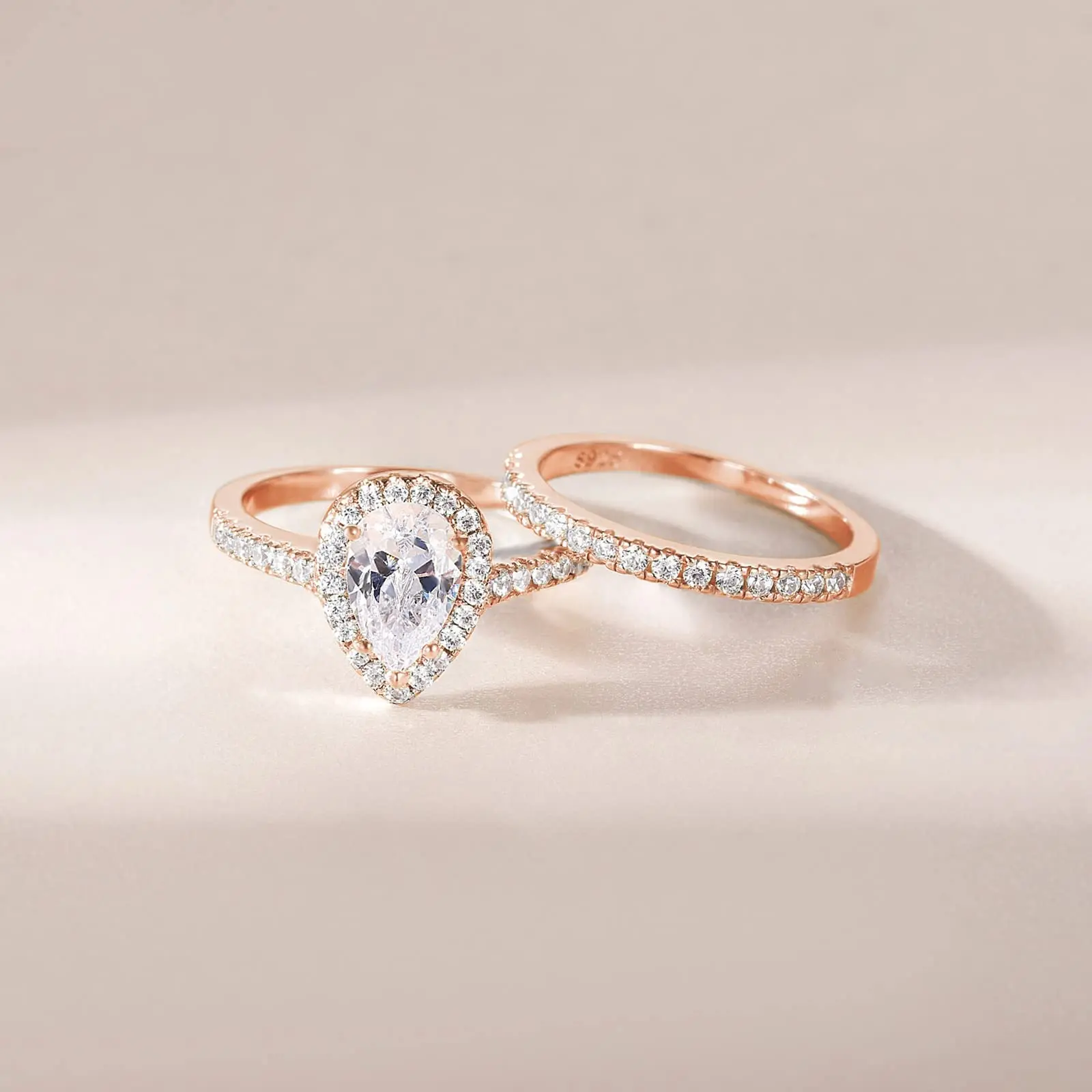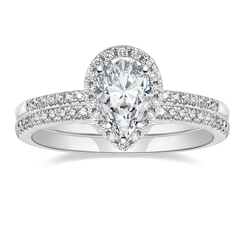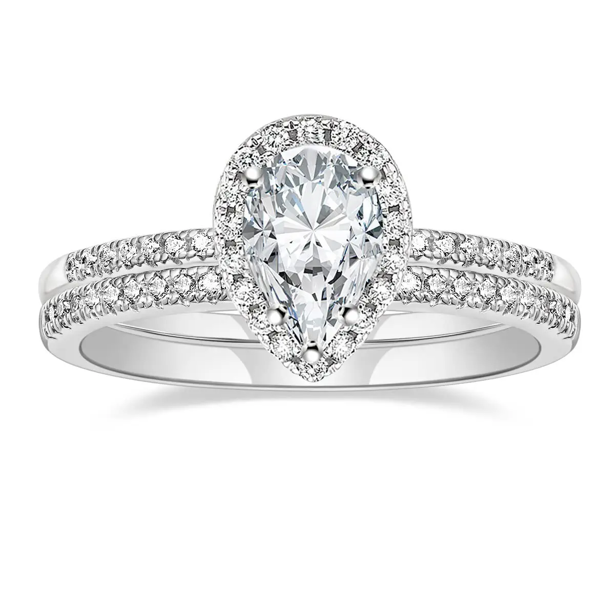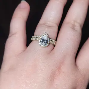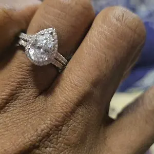 ·♥ Stylish ♥ The wedding ring set includes a 1.5 ct pear-cut halo CZ wedding band and an eternity dainty ring. This ring set has a 5-Prong-Setting craft to prevent the CZ stone fall off, and both sides of the ring features some sparkling petite CZ stone to complement the center cubic zirconia stone