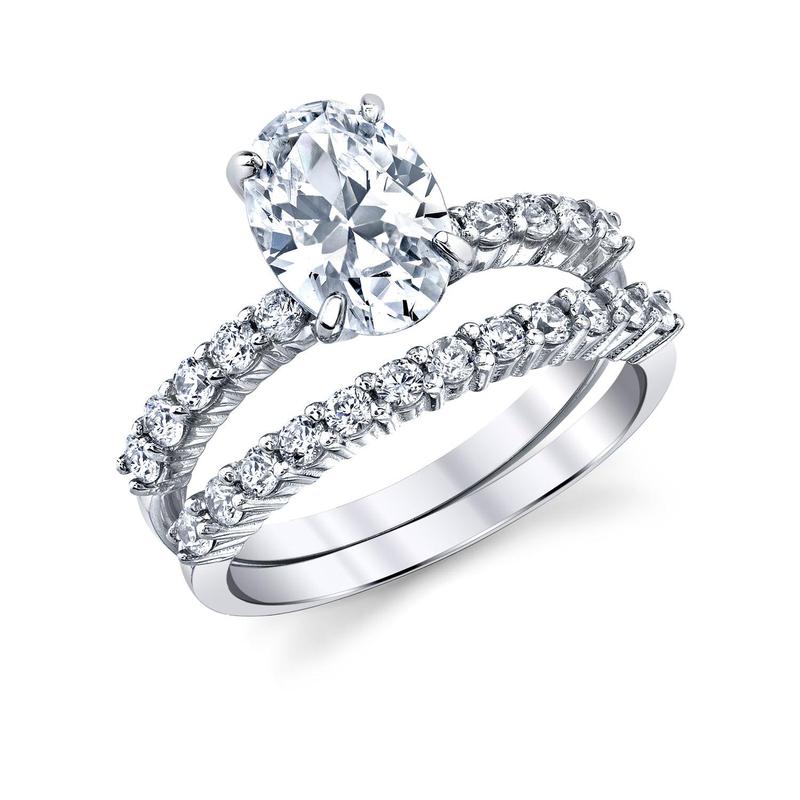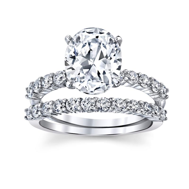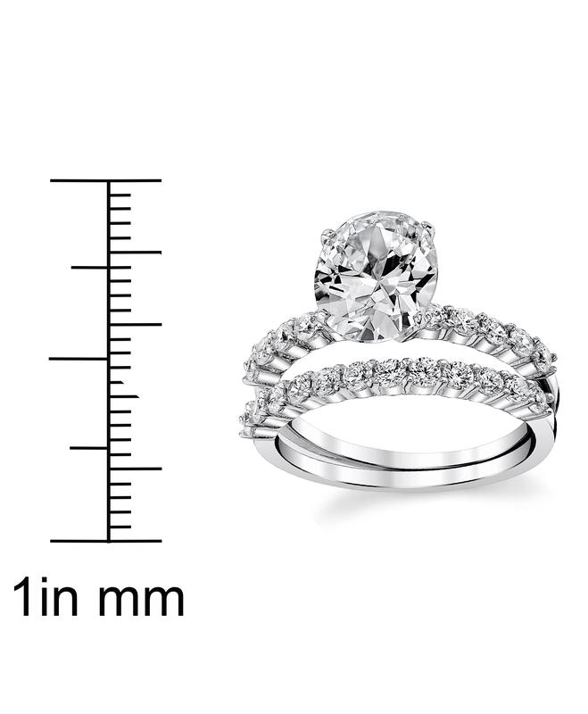 Pop the question with this Sterling Silver Cubic Zirconia 2-piece bridal wedding ring set. It features a glittering engagement ring with a 2 carat prong-set, oval cubic zirconia center stone and small, round-cut, white cubic zirconias gracefully highlighting the shank. A matching wedding band embellished round-cut, white cubic zirconias is included to complete this set. This sterling silver set is enhanced with high polish finish.