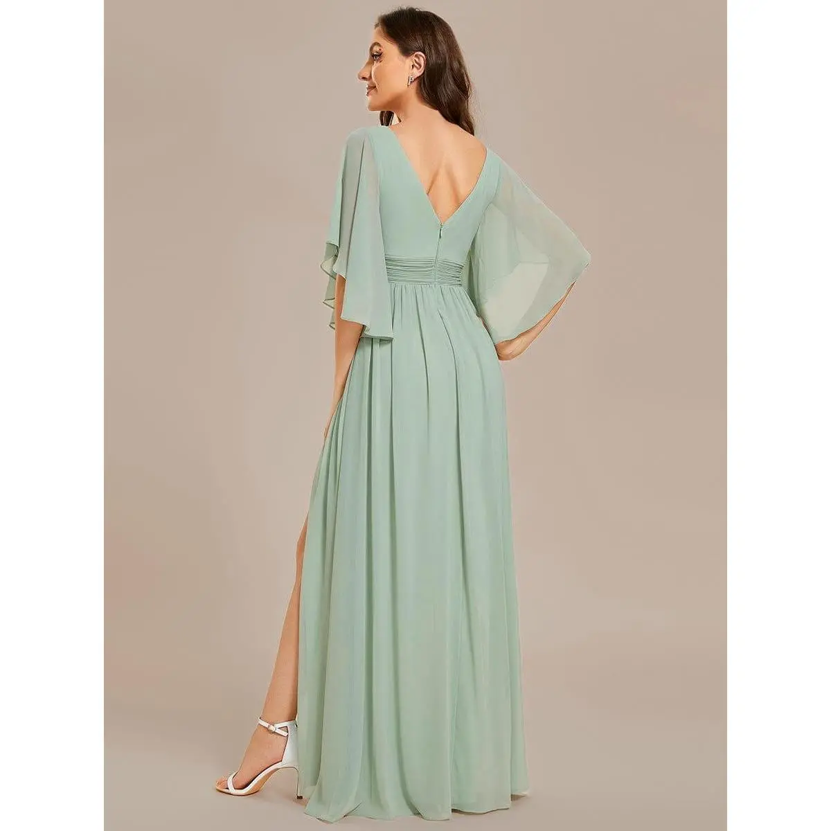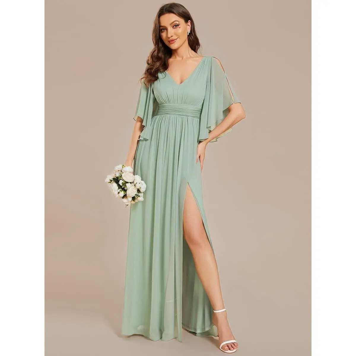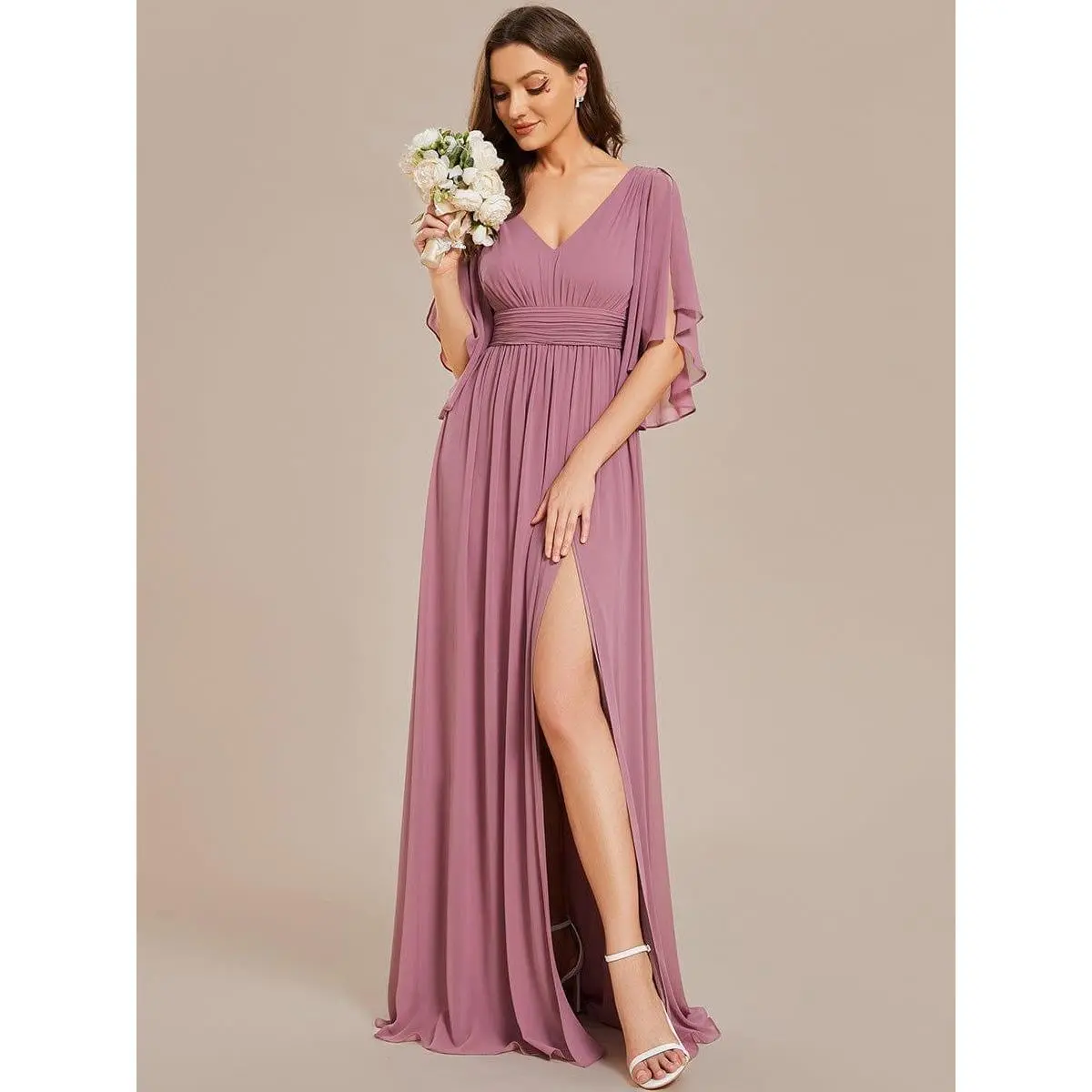 ✨ Elevate your style with this Half Sleeve V-Neck Pleated High Slit A-Line Chiffon Bridesmaid Dress. Perfect for formal events, from black tie to glamorous galas, this dress exudes chic and glamour. The V-neckline and half sleeves offer modesty, while the high slit adds allure. Soft, lightweight chiffon flows gracefully, ideal for dancing the night away.