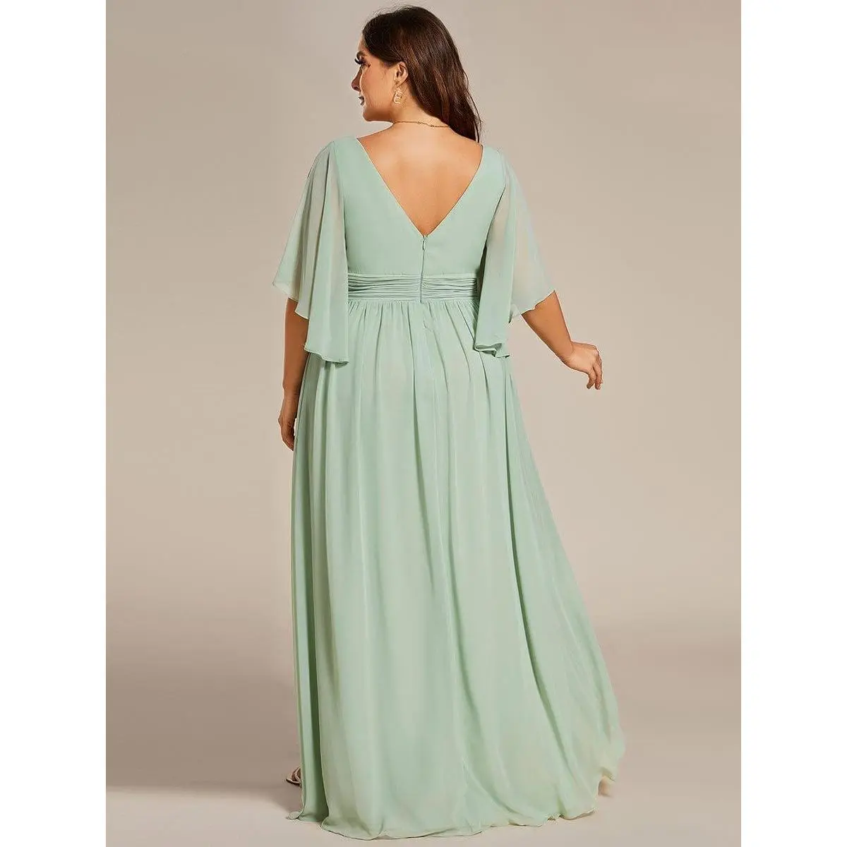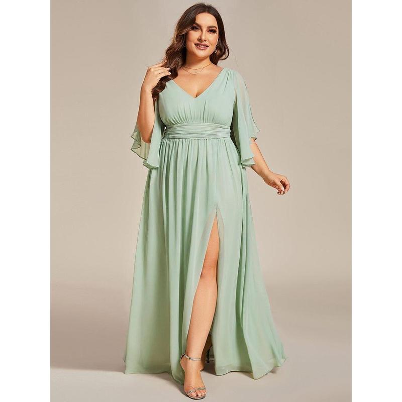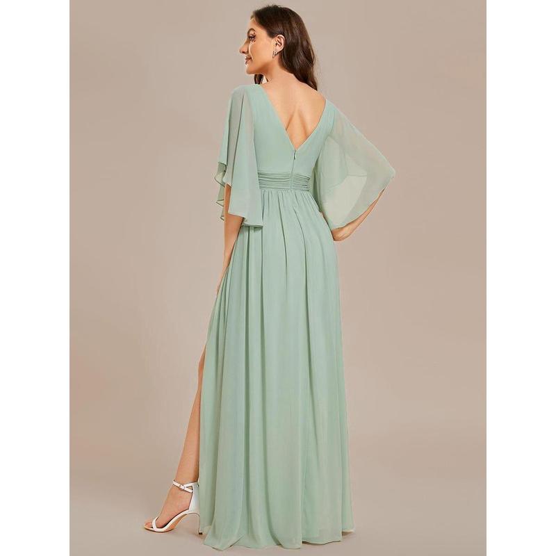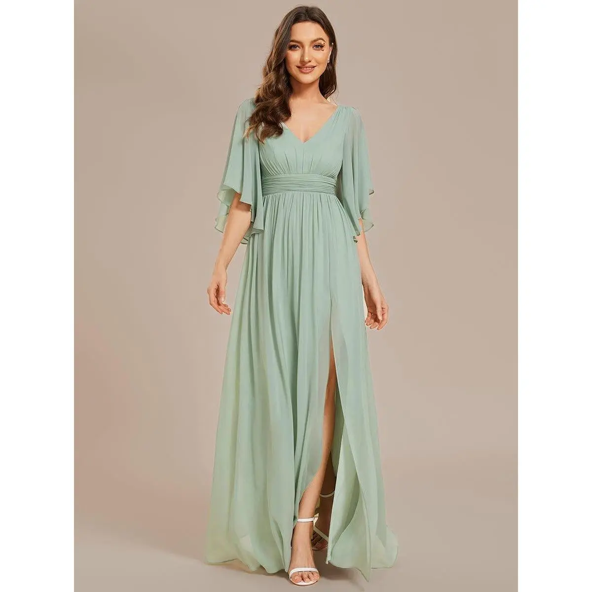 ✨ Elevate your style with this Half Sleeve V-Neck Pleated High Slit A-Line Chiffon Bridesmaid Dress. Perfect for formal events, from black tie to glamorous galas, this dress exudes chic and glamour. The V-neckline and half sleeves offer modesty, while the high slit adds allure. Soft, lightweight chiffon flows gracefully, ideal for dancing the night away.
