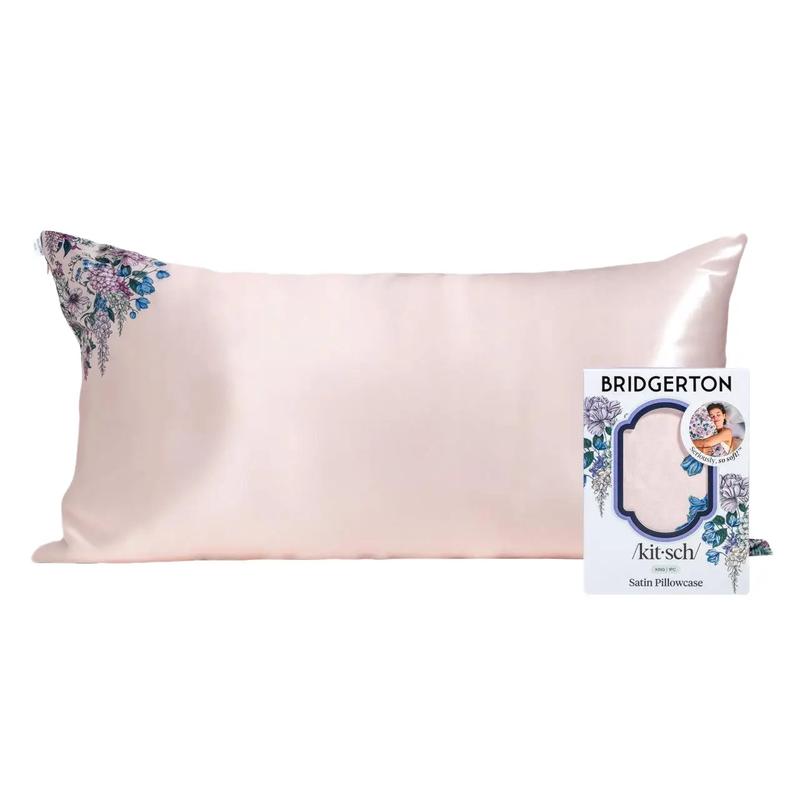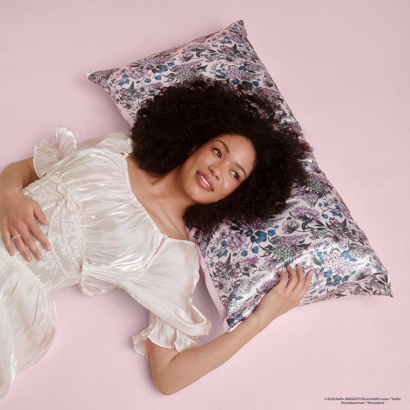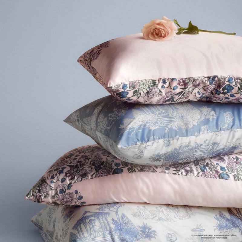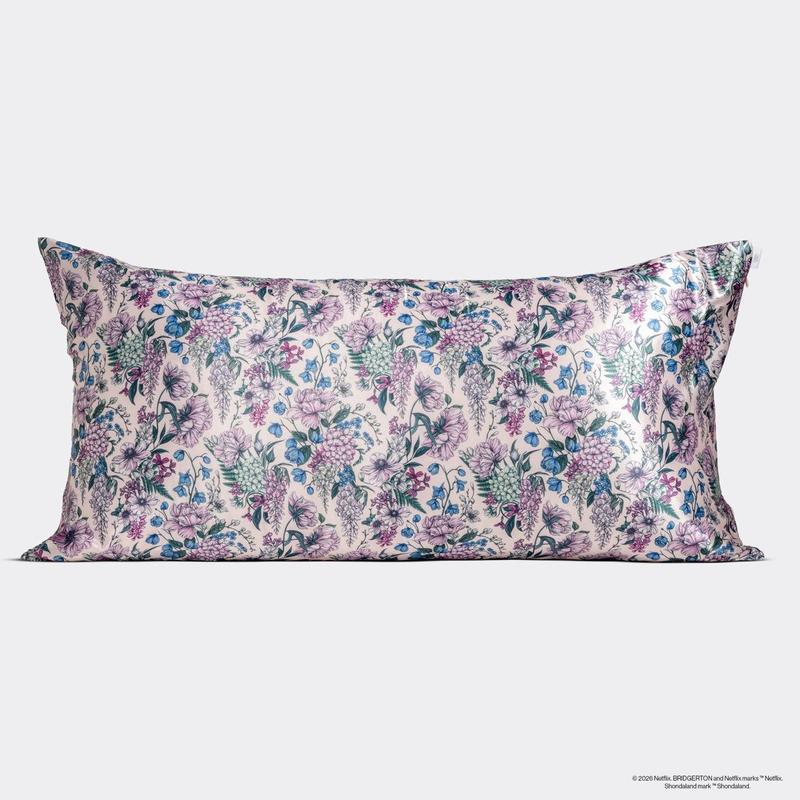 ·Satin pillowcase with a wisteria print on one side and a delicate, floral-edged design on the other—flip for romantic, Regency-inspired style.