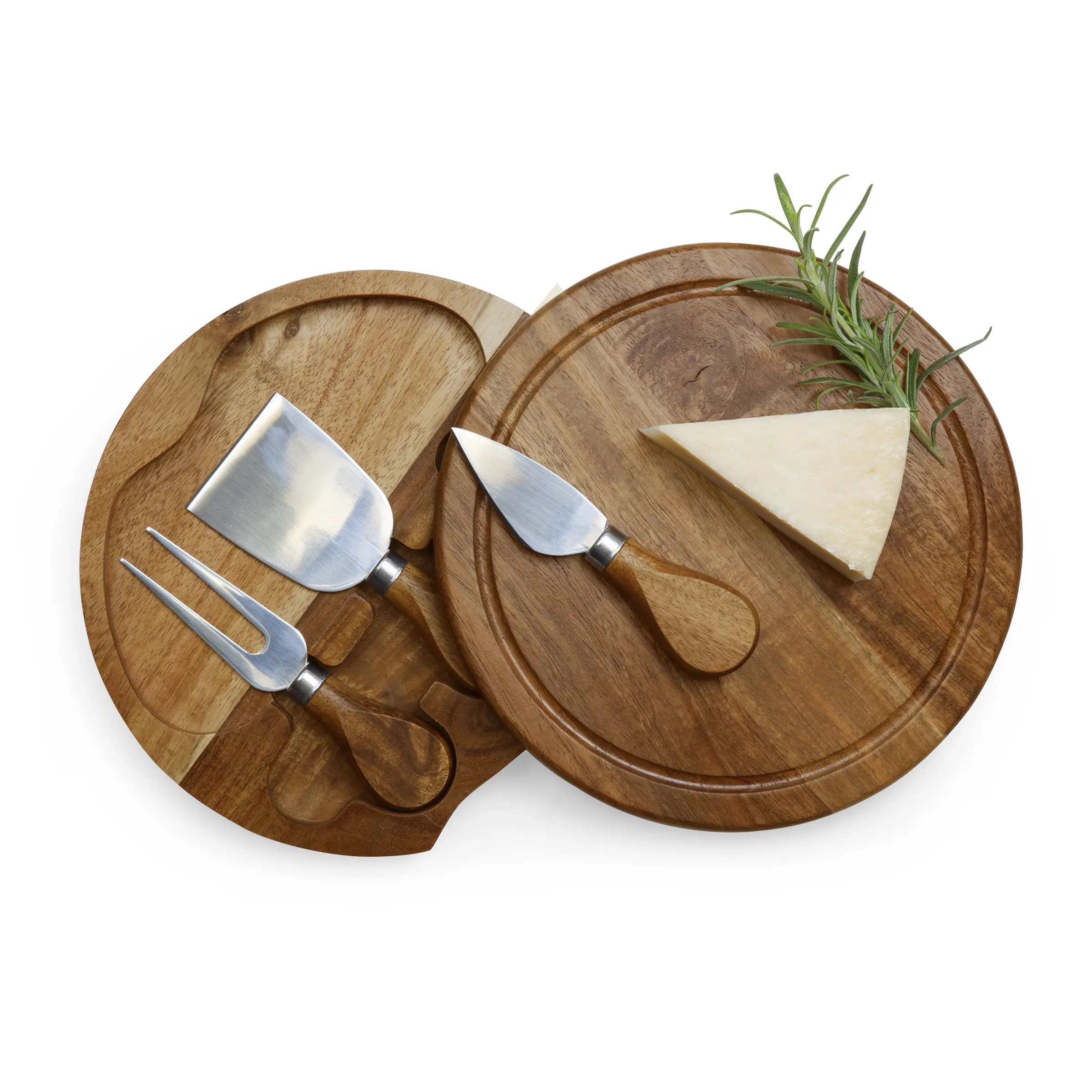 The Acacia Brie Cheese Board and Knife Set is a split-level cutting board that swivels open to reveal three stainless steel cheese tools housed in their own secure grooves.