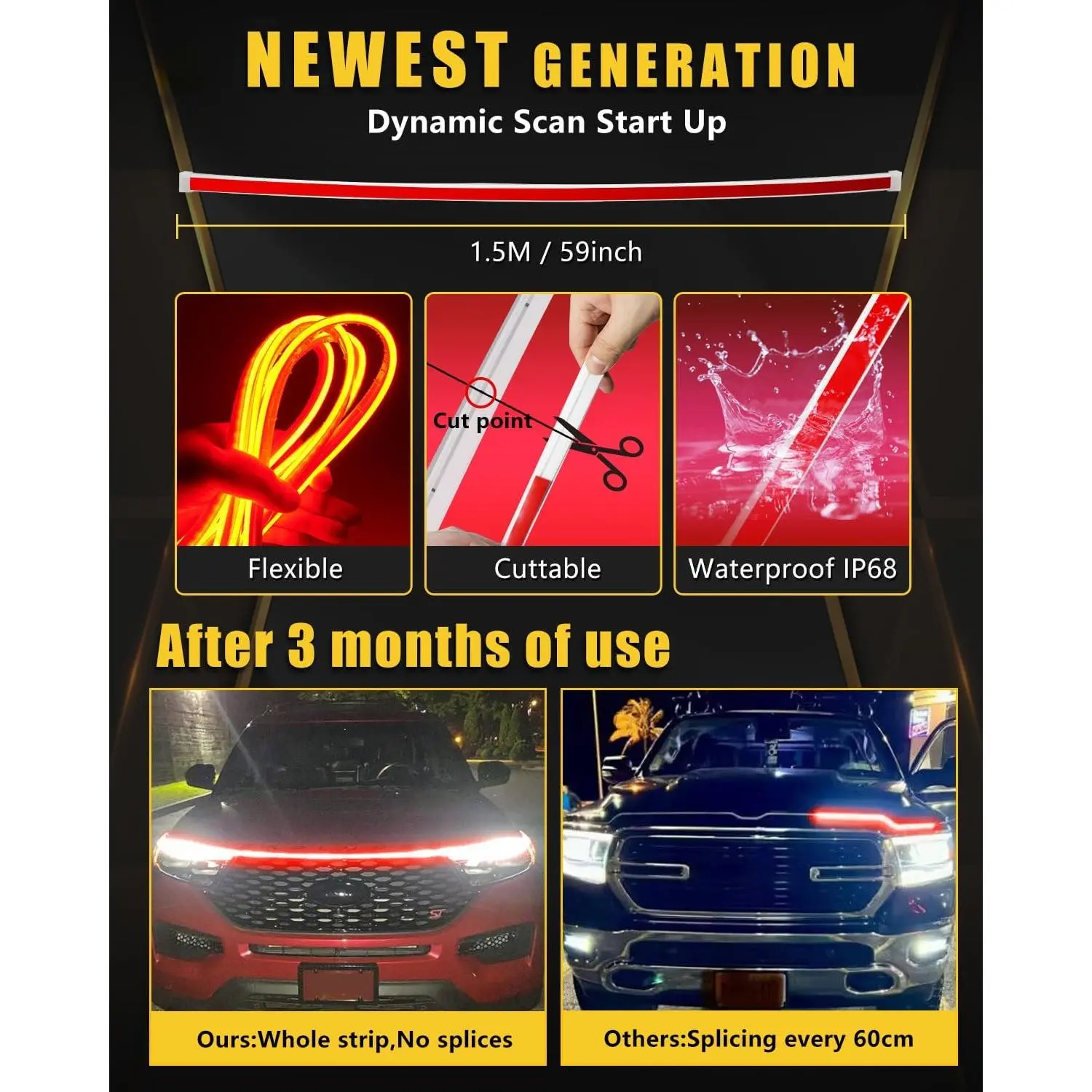 This Led Strip works perfectly as car exterior atmosphere light ,hood light, grill light decoration, daytime running light ,car ambient light.