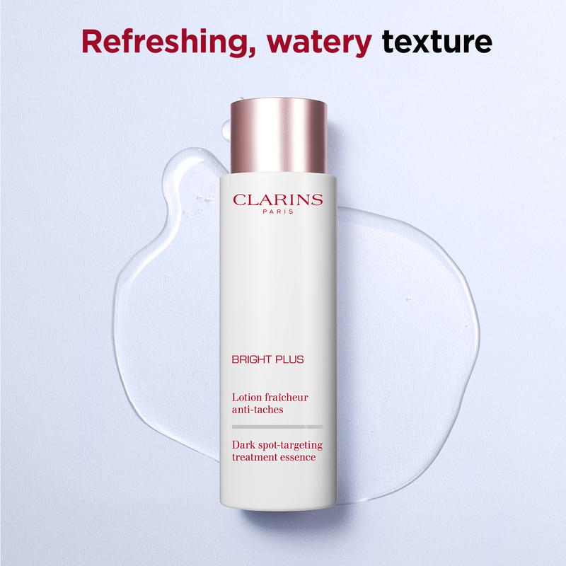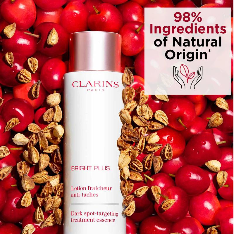 A hydrating treatment essence for normal to dry skin that targets dullness and dark spots for a visibly brighter, more even skin tone. Formulated with 91% ingredients of natural origin, this breakthrough skincare innovation is powered by Clarins’ advanced Brightening Complex of Organic Lady’s Mantle, Organic Sea Lily extracts, and a vitamin C derivative to visibly brighten and reduce the appearance of dark spots. Two powerful superfruits—a blend of Rose Myrtle and Vitamin C-rich Organic Acerola Seed extracts—deliver a double shot of oxygen to promote healthy-looking, radiant skin. The sensorial milky texture contains deeply hydrating Vegetable Squalane from Sugar Cane for a soft, supple, comfortable complexion. Use after cleansing to boost the benefits of the Clarins skincare to follow.