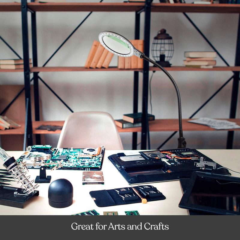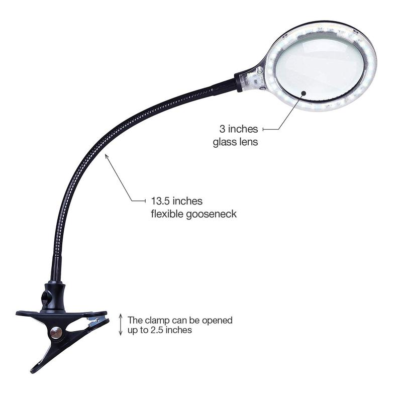 ·Adjustable Magnifying Desk Lamp With Gooseneck: The glass lens has a 13.5" adjustable, flexible gooseneck, can be adjusted up and down, you can use the magnifying glasses with light for close work at any angle, freeing both hands. Suitable for repairing electronics, soldering, crocheting, painting, jewelry, facial, manicure, puzzles, etc.