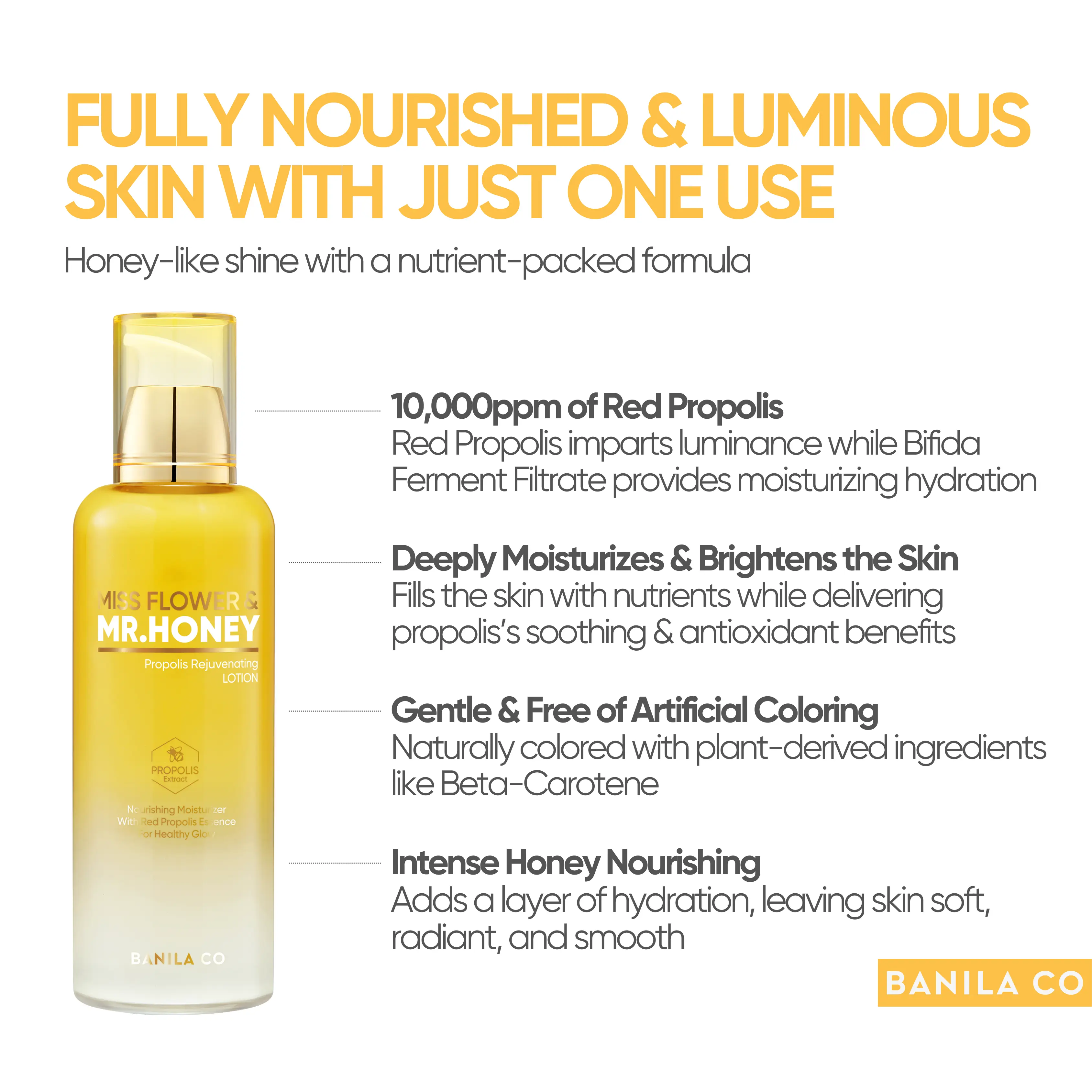 A silky, lightweight lotion formulated with propolis and honey-derived nutrients to help nourish skin, strengthen moisture balance, and maintain a healthy glow without feeling heavy.