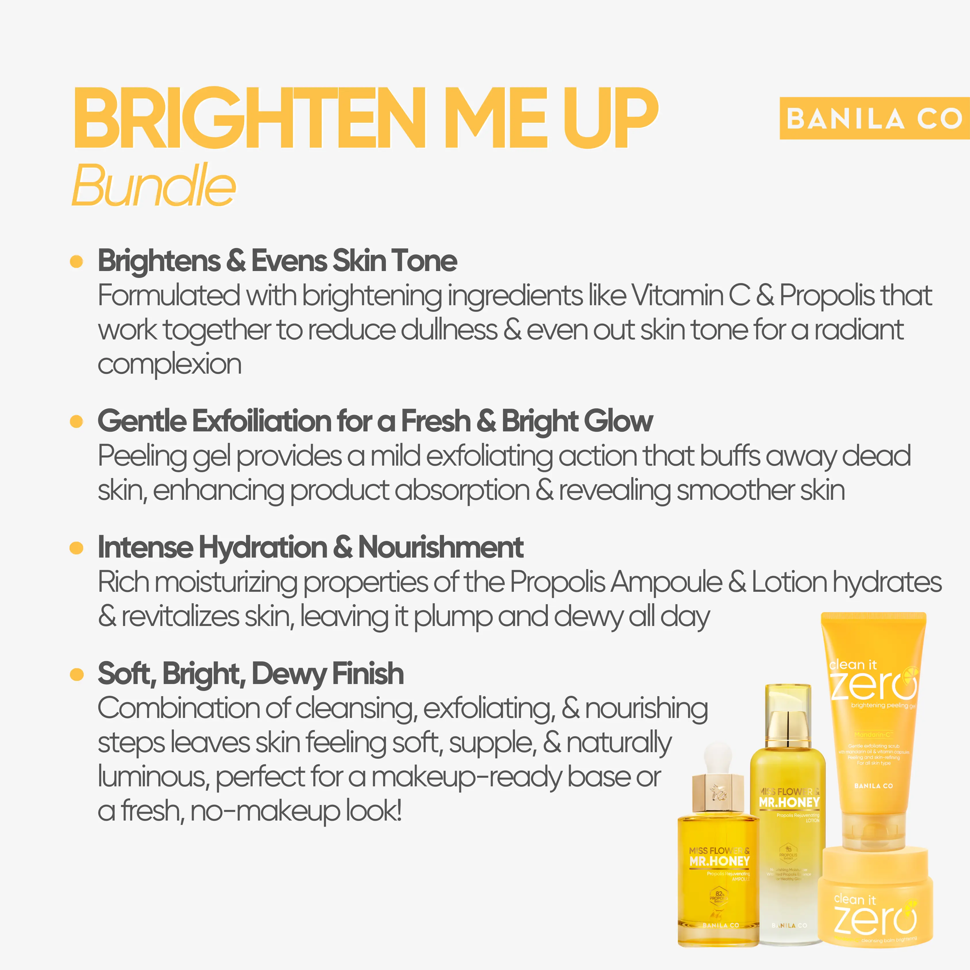 A thoughtfully curated skincare set powered by brightening and nourishing ingredients like Vitamin C, honey, and propolis. Designed to be used together or mixed into your routine, each formula helps revive dull-looking skin, support hydration, and enhance natural glow.