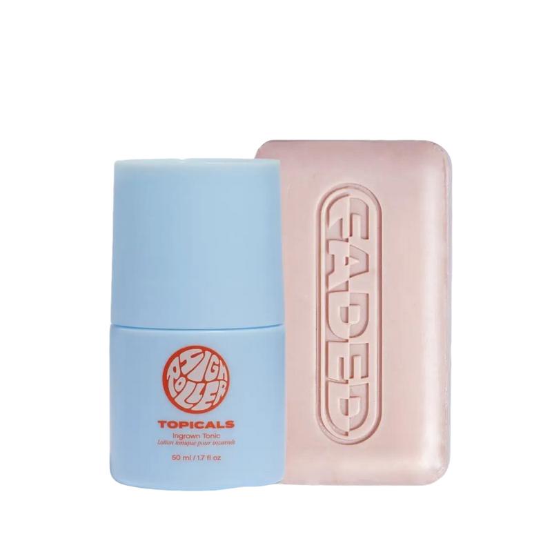 Transform your skincare routine with the Faded Brightening Cleansing Bar (2 Pack) and High Roller Ingrown Tonic, a powerhouse pair designed to tackle dark spots, discoloration, ingrown hairs, and razor bumps.