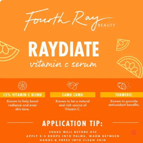 WHAT IT DOES – Ego Boost Brightening Serum Stick is formulated with Vitamin C to help brighten the complexion and boost radiance. RAYDIATE Vitamin C Brightening Serum is a specially designed bi-phase serum + oil that is powerfully formulated with a Vitamin C Blend for a more luminous complexion. THE GOOD STUFF – Ego Boost: Vitamin C, Turmeric + Camu Camu