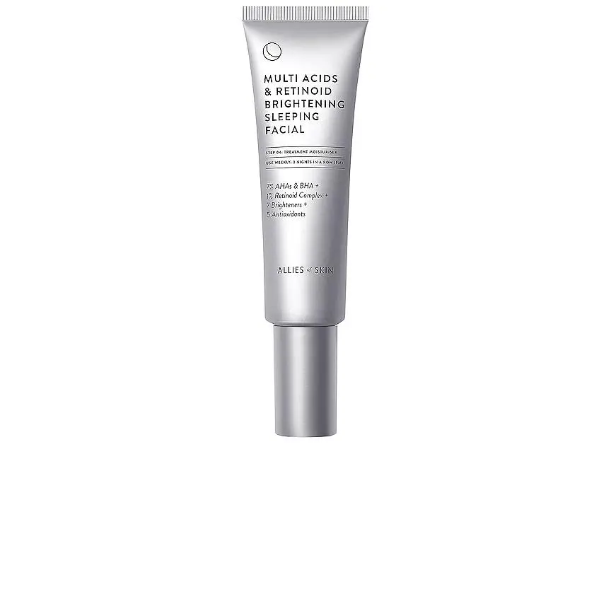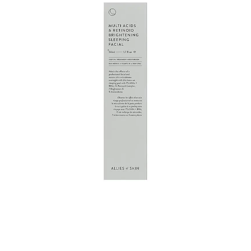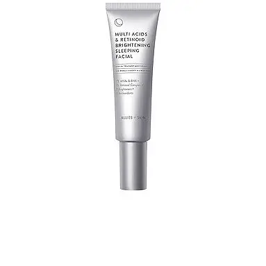 ·Allies of Skin Multi Acids & Retinoid Brightening Sleeping Facial is a leave-on sleeping peel that is supercharged with a blend of 7% AHAs + BHA, 1% Retinoid and 7 Brighteners, to give you the effects of a professional facial overnight
