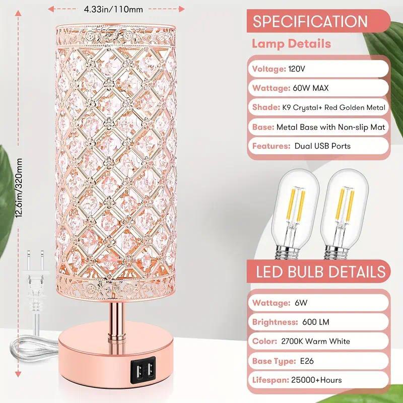 5. 2 Pack/1 Pack Touch Control Crystal Table Lamps With 2 USB Ports, 3-Way Dimmable Bedside Nightstand Lamps With Decorative Crystal, Small Table Lamps For Bedroom Living Room, Office, Led Bulbs Included