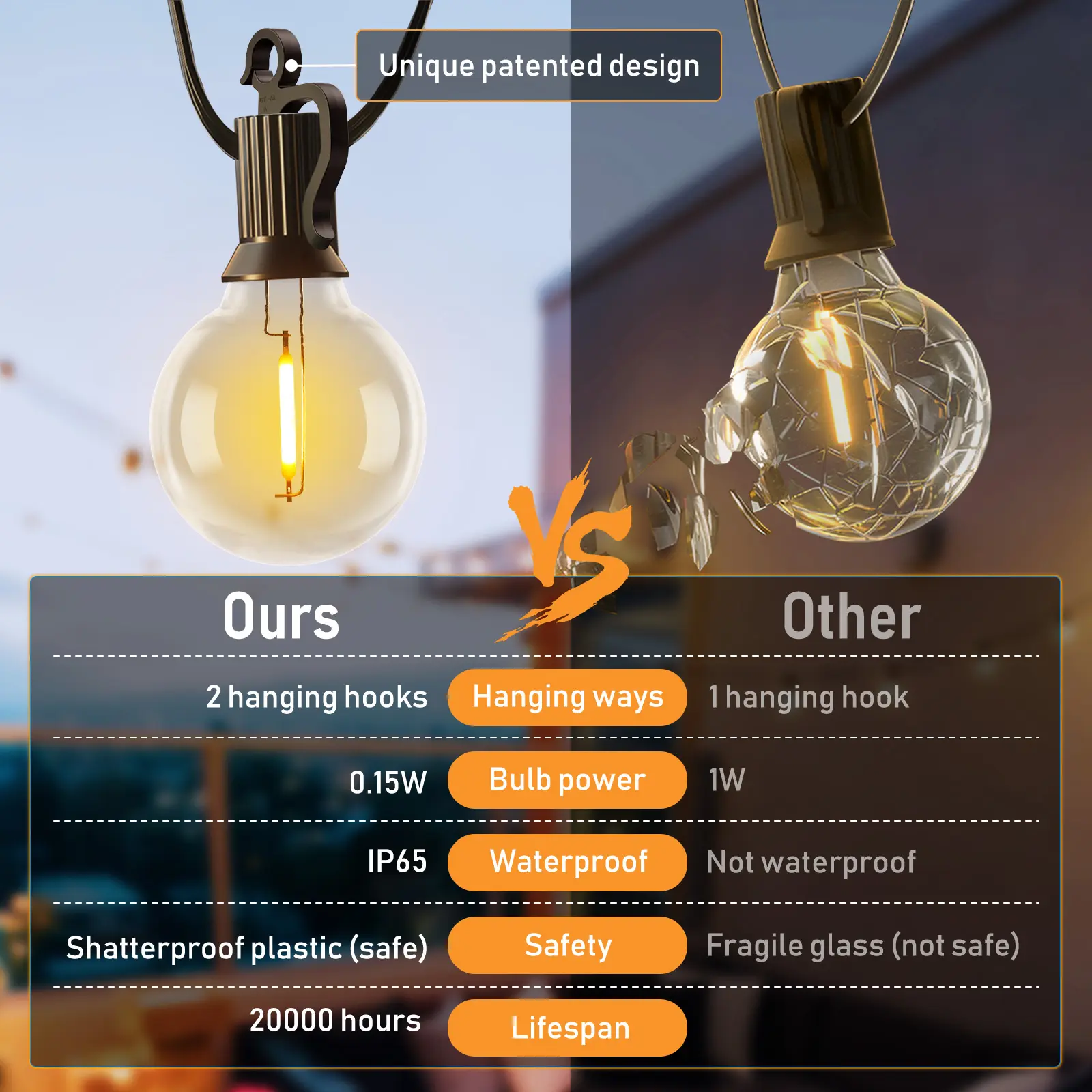 Commercial Grade Solar Outdoor Lights: Raining? Windy? Scorching? Snowing? No problem. This outdoor solar string light can withstand extreme weather conditions, including heat, heavy rain, and strong winds. These waterproof outdoor garden lights can handle it all. The shatterproof bulbs can withstand any harsh weather in daily life, so you won't be bored anymore.