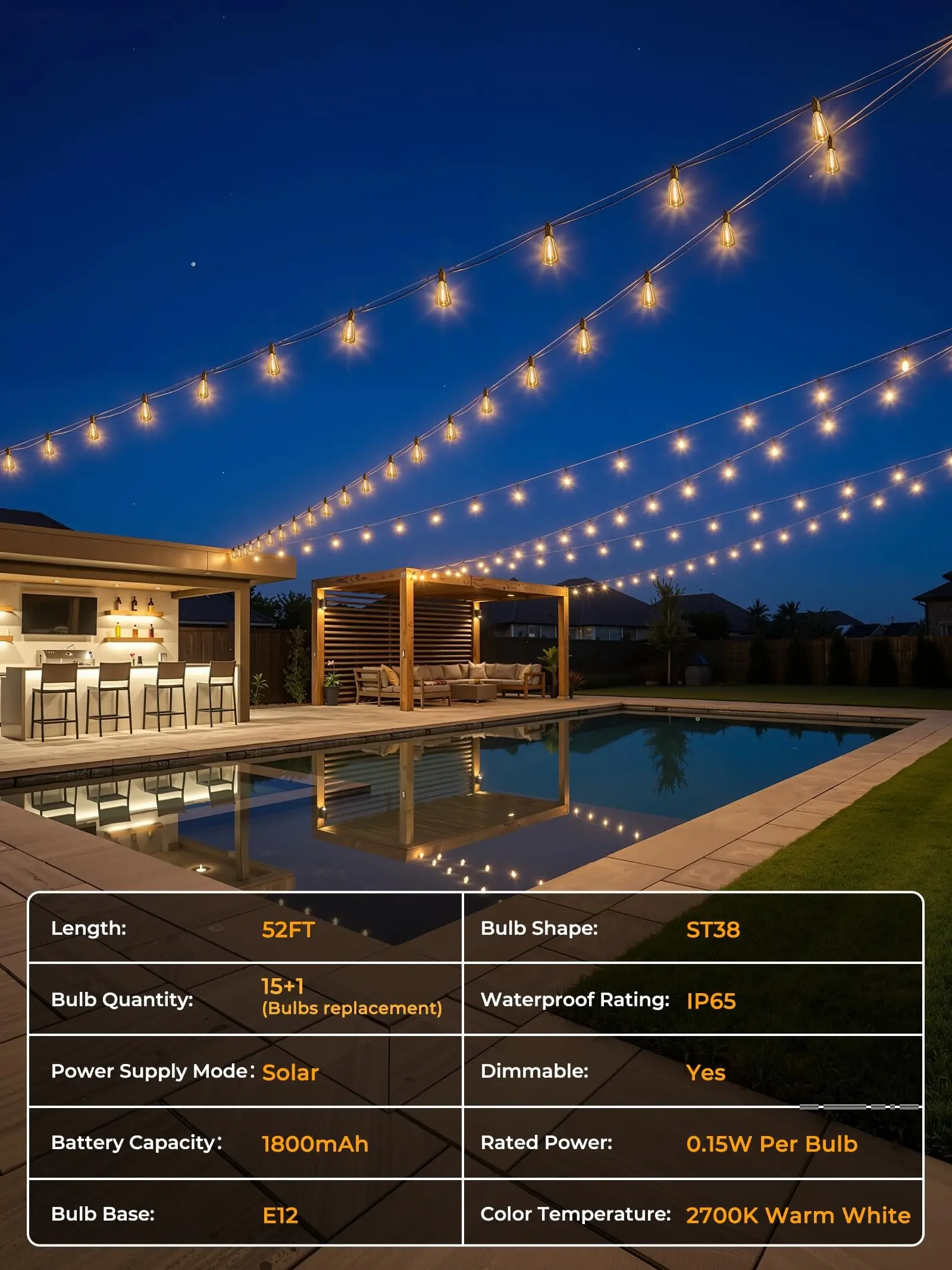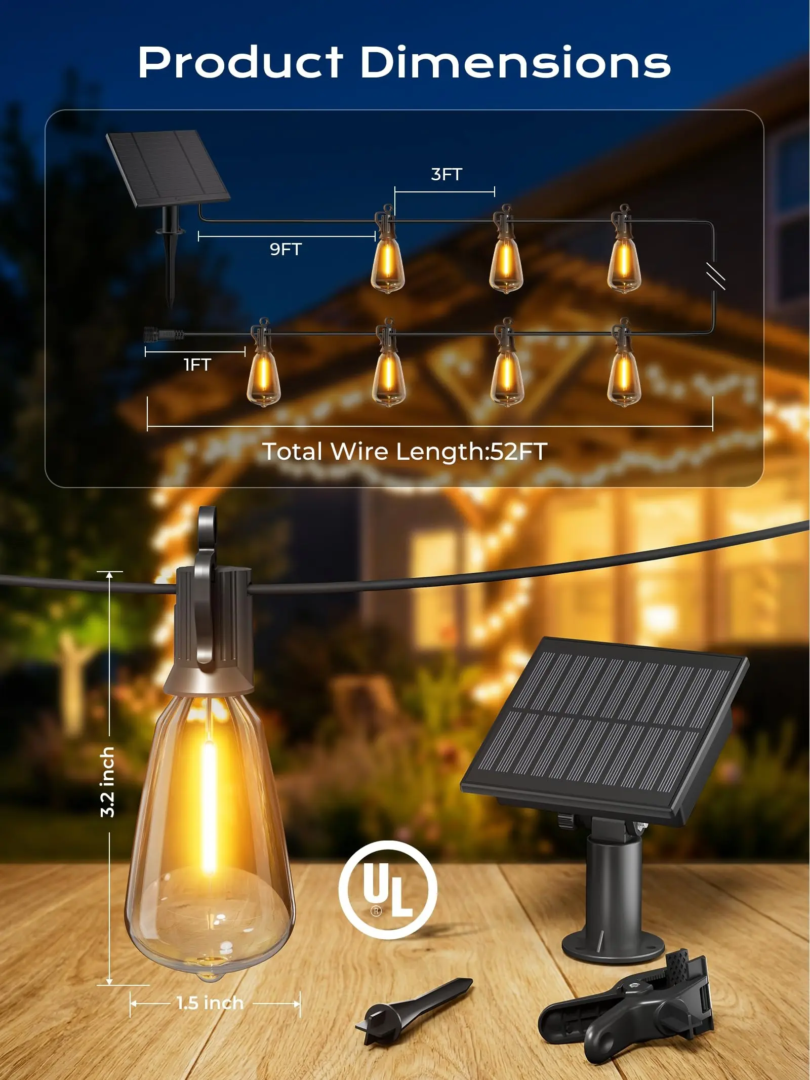 ·【Solar Powered & Dual Charging】52FT solar string lights with 15+1 shatterproof LED bulbs (E12 base) – harness solar energy for eco-friendly lighting, no outlet needed! Equipped with dual solar/USB charging (4-6hrs fast charge) for 8-10hrs long-lasting glow, rain or shine. Perfect for cord-free decor in patios, gardens, and backyards, cutting electricity bills while going green.