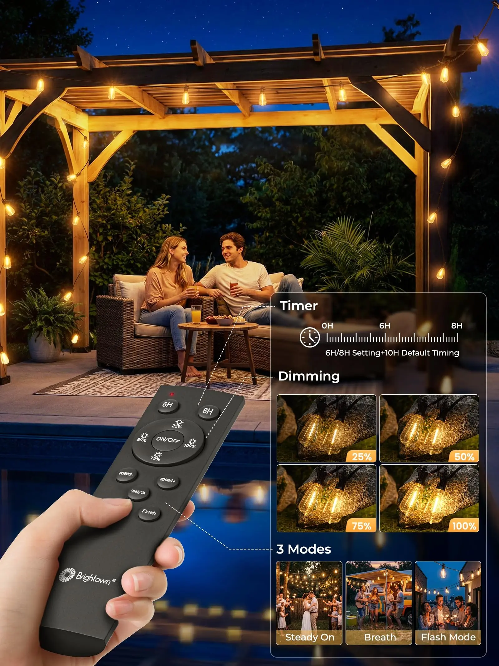 ·【Remote Control & Multi Modes】Upgrade your ambiance with the multi-function remote: adjust 4 brightness levels (25%/50%/75%/100%), cycle 3 light modes (Steady On/Breath/Flash), and set 6/8hrs auto-off timers—no extra dimmers or timers required. Effortless hands-free control for patio parties, camping trips, or daily outdoor lighting.