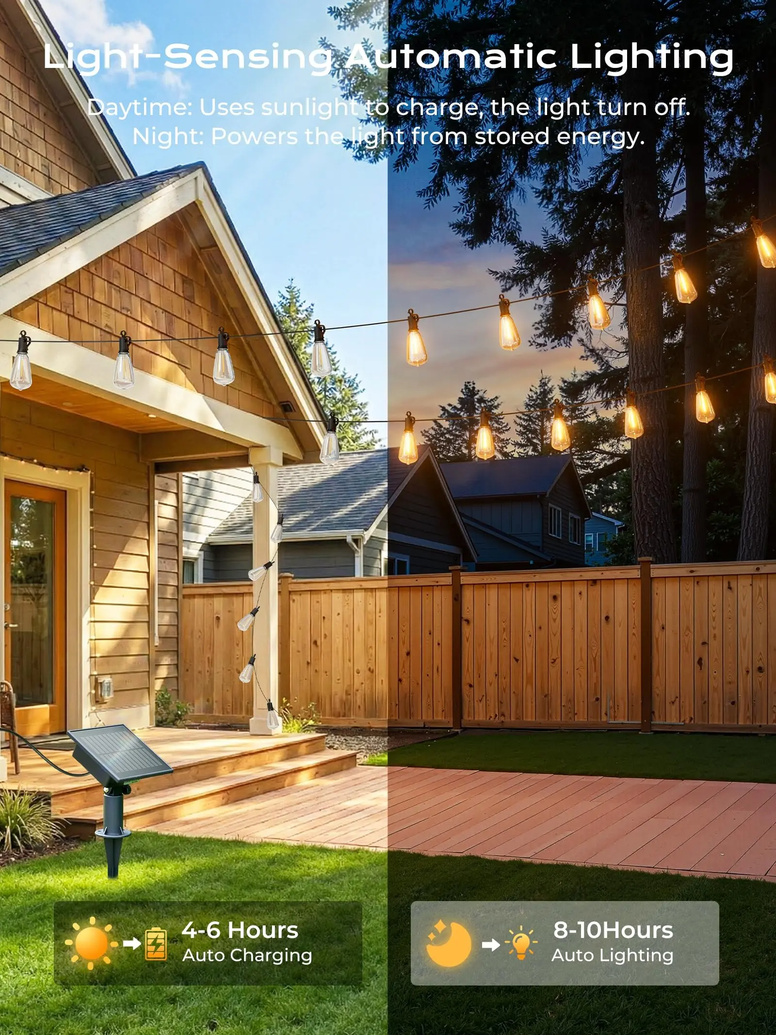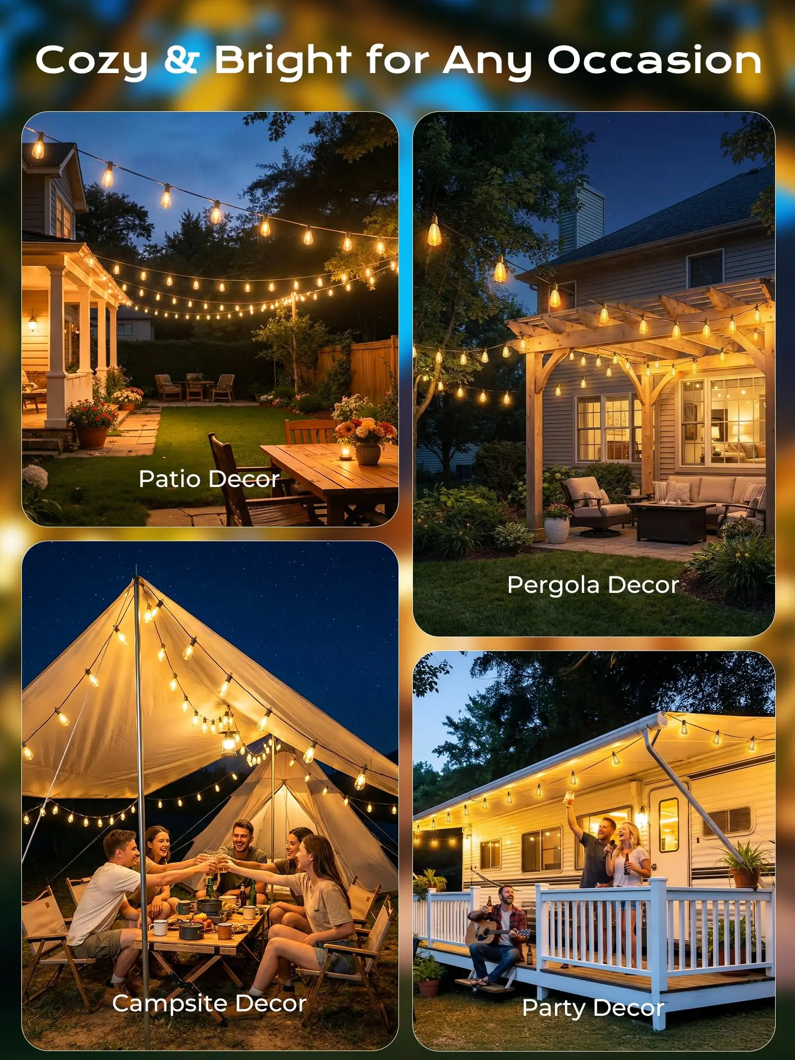 ·【Versatile Outdoor Decor】Ideal for Christmas, weddings, birthdays, housewarmings, or backyard BBQs—add warmth to every occasion. These solar string lights fit bistro, cafe, or everyday outdoor charm, decorating pergolas, fences, tents, or porches freely. Ditch outlet constraints and craft your perfect outdoor oasis with minimal effort.