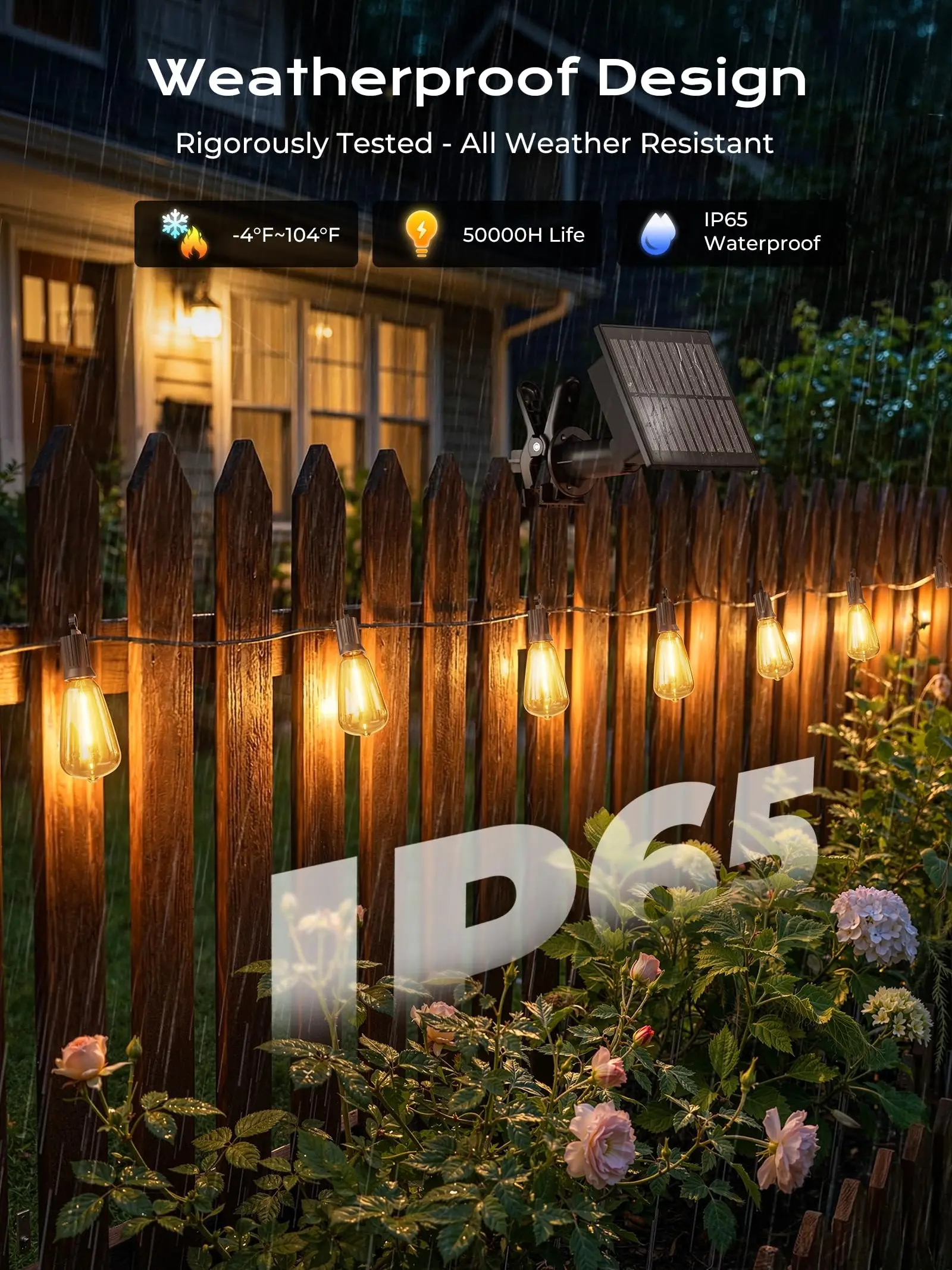 ·【All-Weather Durability】IP65 waterproof & weather resistant design withstands rain, snow, wind, and heat—no flinching at storms or harsh weather. Crafted with shatterproof materials, with a 52ft total length (including a 9ft lead wire and 1ft tail wire for easy installation) and 3ft bulb spacing, these lights provide ideal coverage for year-round outdoor use. Easily install on fences, pergolas, trees, or decks to add a warm glow to your outdoor space.