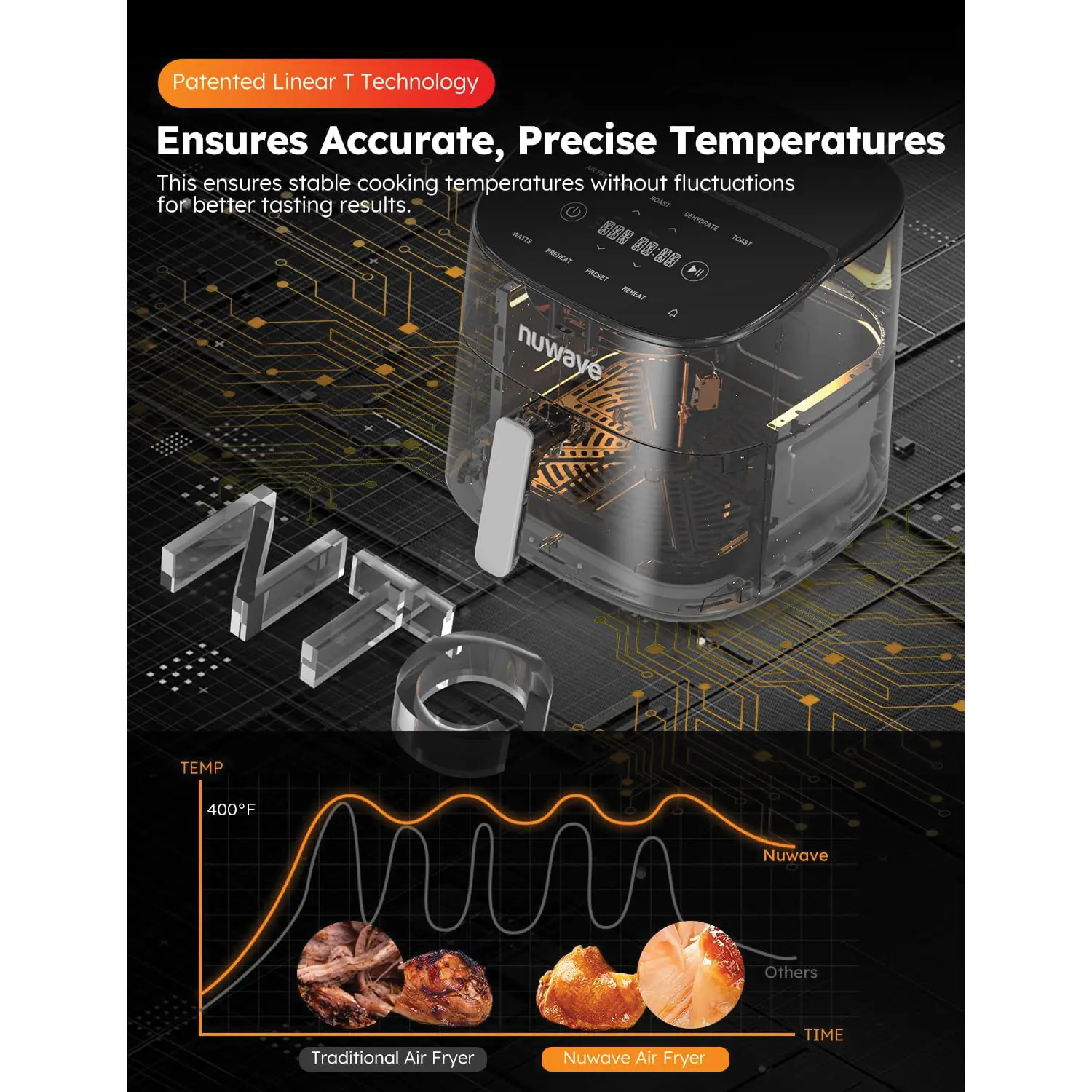 ·PRECISE DIGITAL TEMPERATURES - Set cook temperatures from 50°F to 400°F adjustable in precise 5°F increments. Unlike the primitive methods that regulate temperature by turning the heater on and off, our heater never turns off but executes constant adjustments throughout the cooking process.