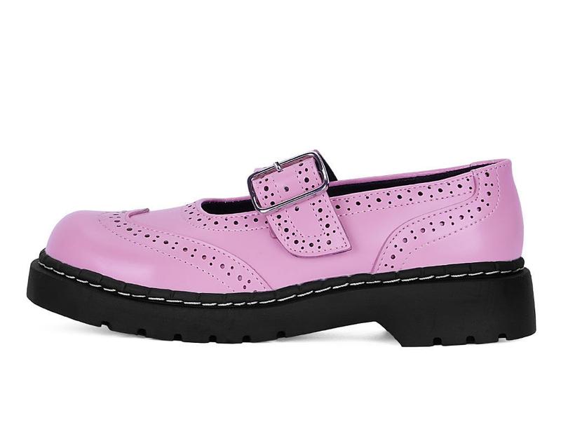 The T.U.K. Brogue Mary Jane. Pink Leather, with Brogue Punched Details, a Silver Metal Buckle, and a 1 1/2 inch Heel.