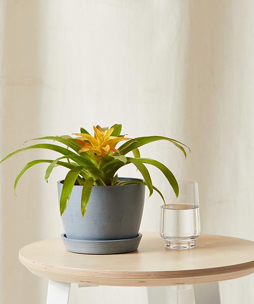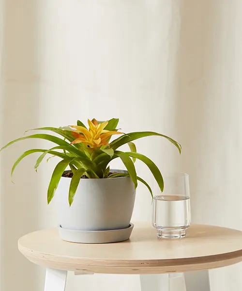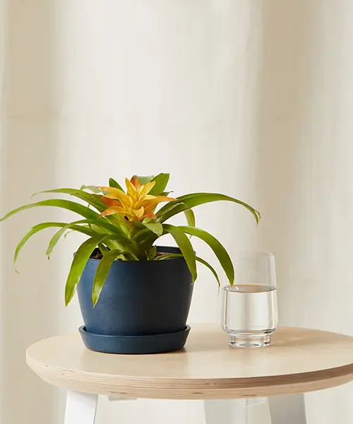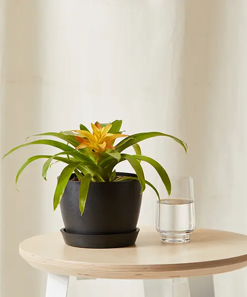 The Bromeliad Guzmania adds a bold pop of color among a sea of green. With unusually long-lasting flowers, bromeliads are the gift that keeps on giving since they naturally grow pups that will develop their own bright flowers. This also means the mother plant will die off one day and be replaced by these pups, so don’t worry if you notice that flower color fading in a few months! This is natural. Guzmania-type bromeliads hail from South America. In their native habitat, they’re epiphytic, meaning they grow on other plants like trees. They get their moisture from the rainwater that their vase catches and the water vapor in the air. Keep this center vase filled halfway with water at all times and you’ll have this tropical beauty thriving in your home.