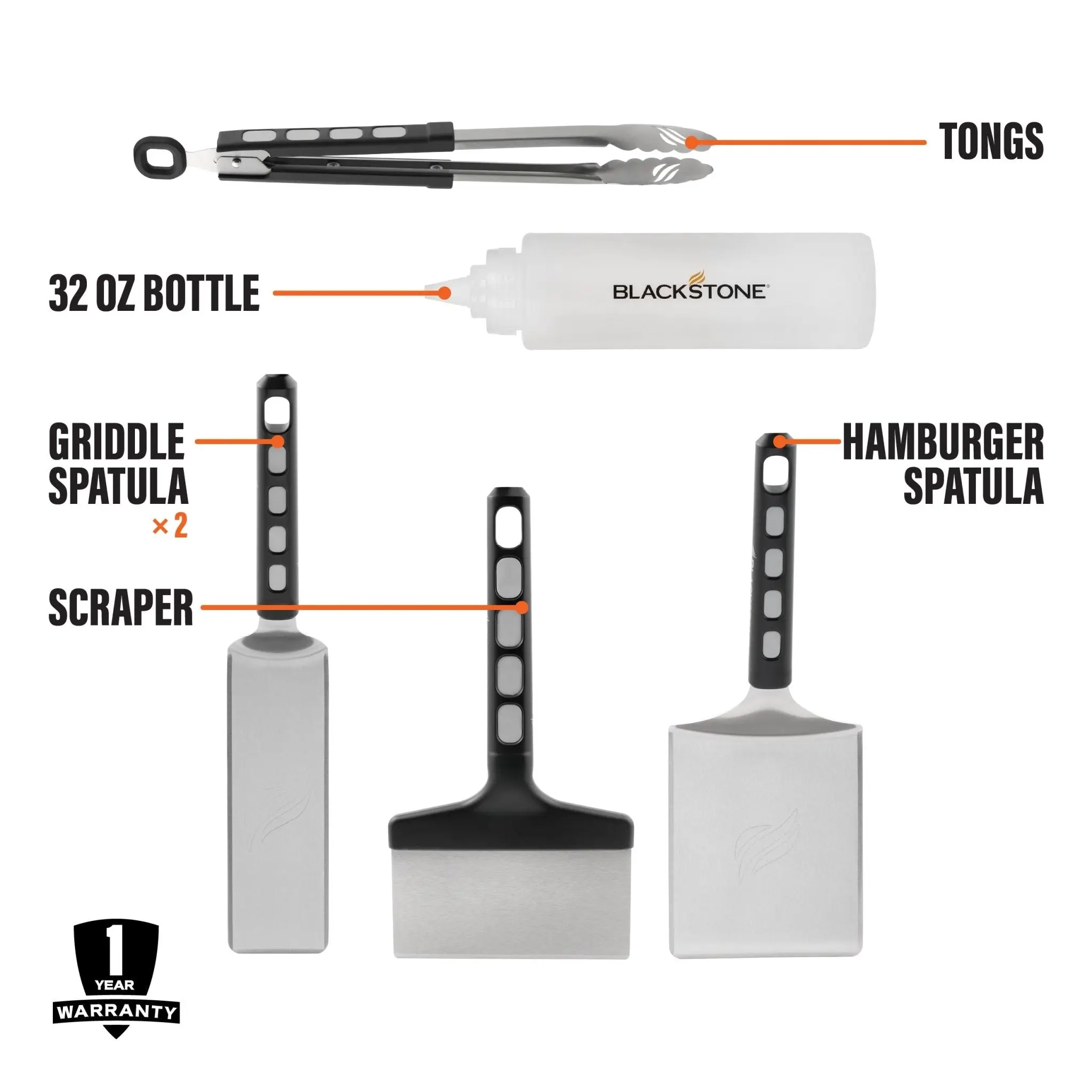 The Blackstone Bronco Essential Toolkit comes equipped with everything you need to cook delicious meals anytime. The griddle scraper is a must-have cleaning tool paired with the 32oz squeeze bottle for loosening up those stuck-on messes. The spatulas and tongs make flipping and turning easy, so you’ll be cooking breakfast, lunch, and dinner in no time!