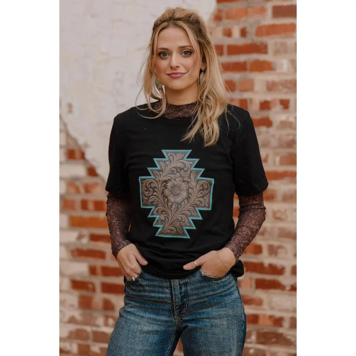Rock a bold statement with this striking black tee featuring an intricate Aztec design adorned with tooled leather look detailing. The geometric patterns pop with a vibrant turquoise outline, creating eye-catching contrast against the classic black base. Perfect for anyone who loves cultural-inspired fashion with an edgy twist. Comfortable, versatile, and undeniably cool—this tee transforms your everyday look into something memorable.