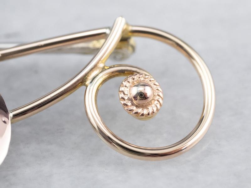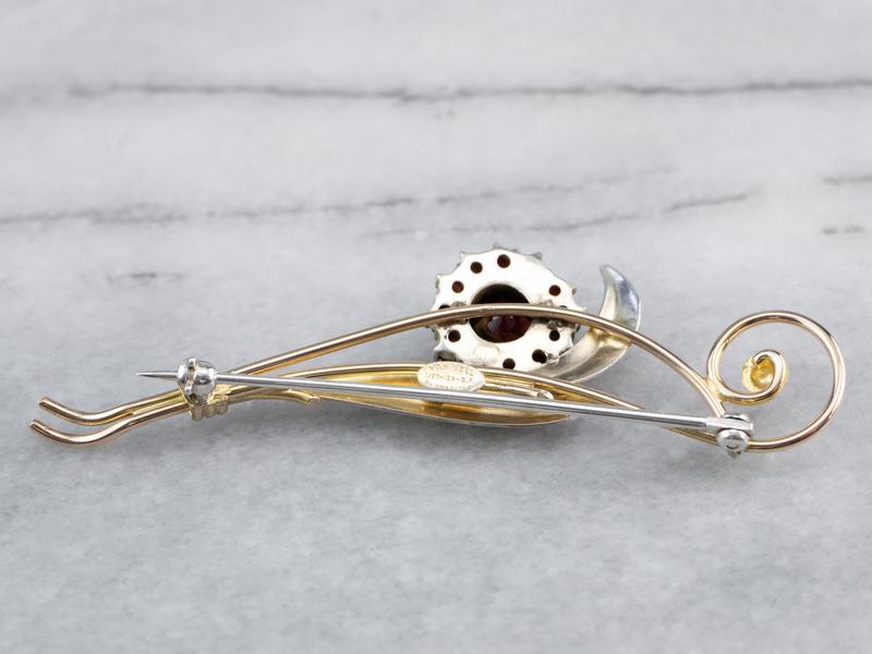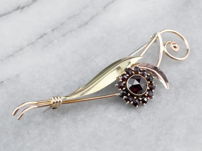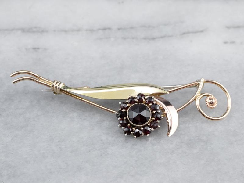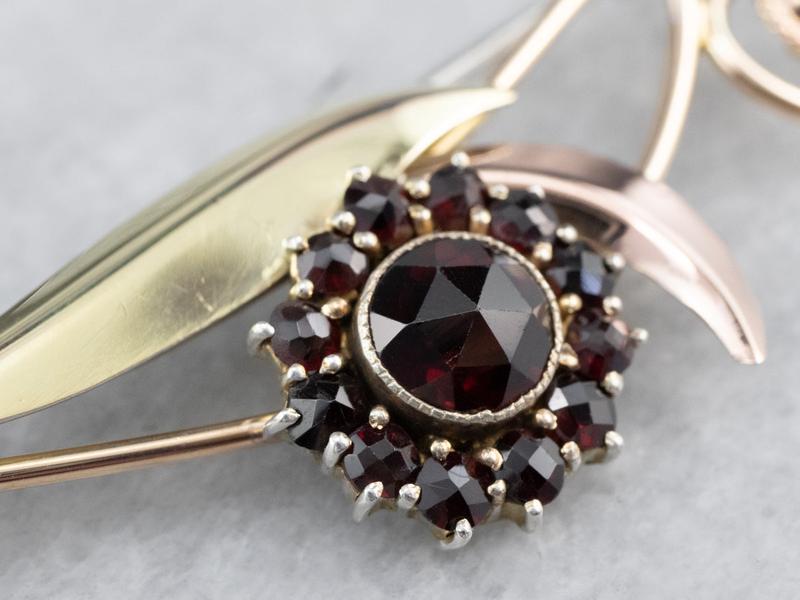 Uniquely designed, we've handcrafted this piece right here in our New Hampshire studio! A mid-century gold fill brooch, with a botanical design, has been set with a glittering antique Cezch garnet floral halo. Wonderfully polished, this lovely piece is ready to wear or gift!