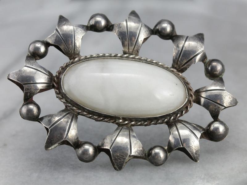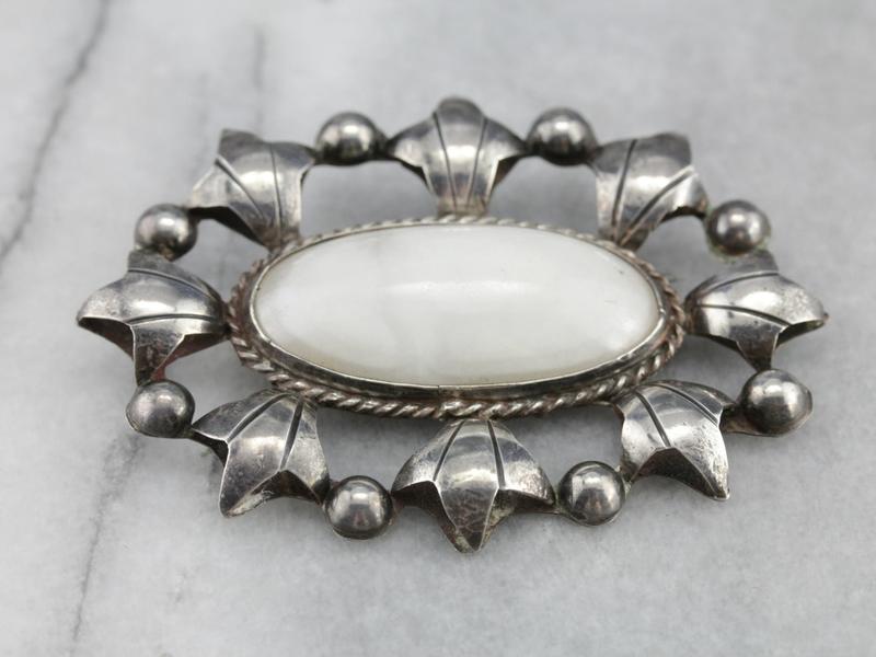 Crafted from coveted Mexican silver, this brooch is generous in size. The cabochon is white marble, with cloud-like milky swirls that stand out nicely against the patina of the silver.