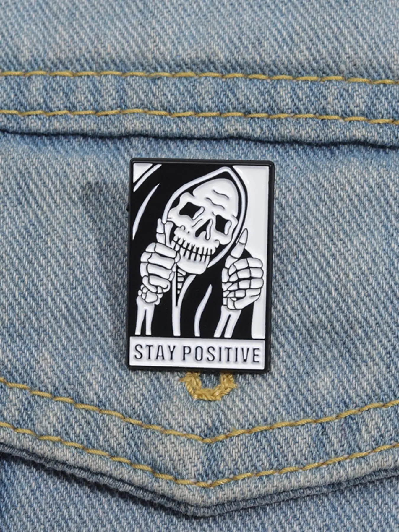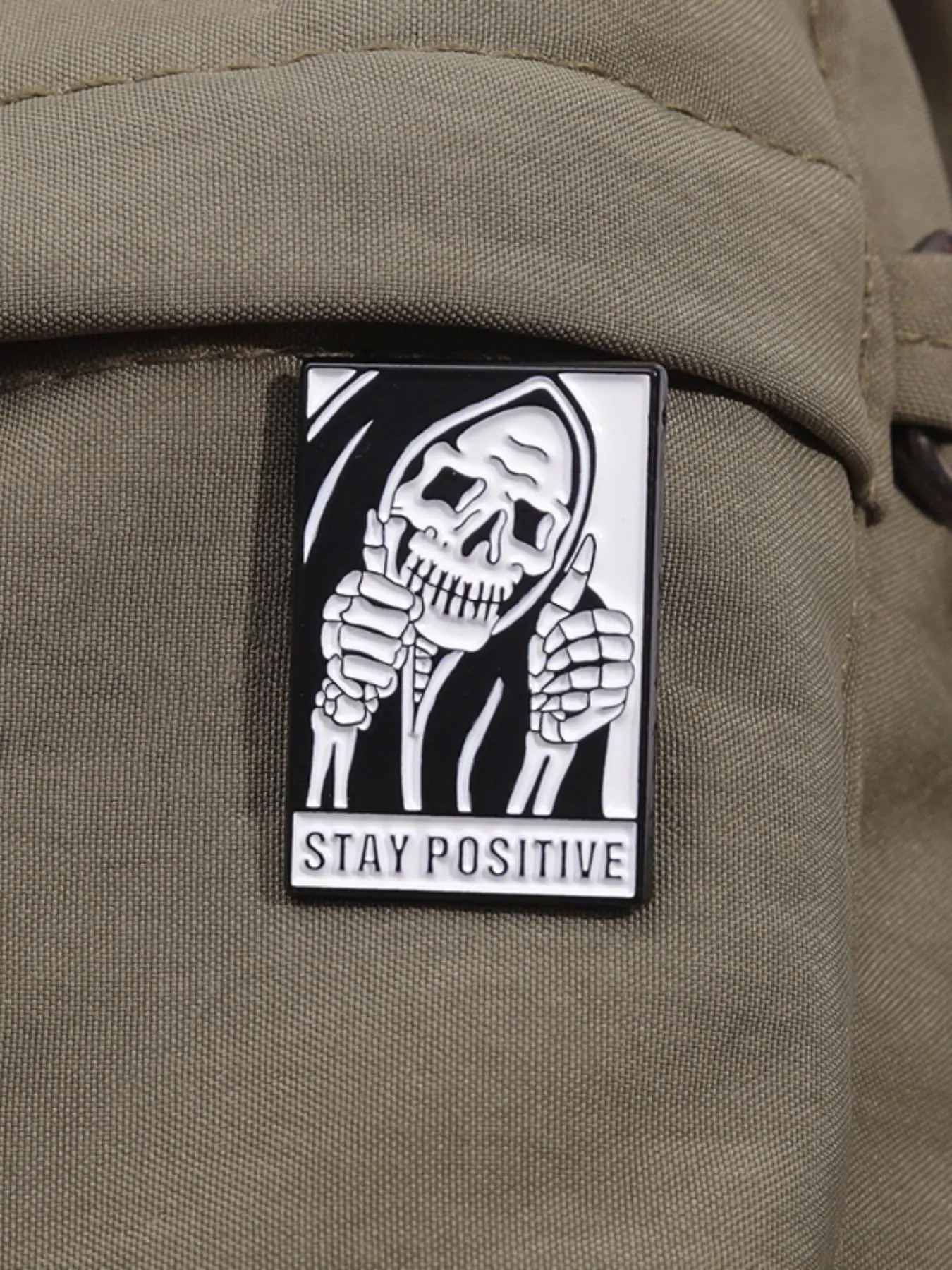 One on my many pins lol super funny and cute and good quality the backing on it is a little short, but nonetheless was still able to push it through this bag and it stayed on fine