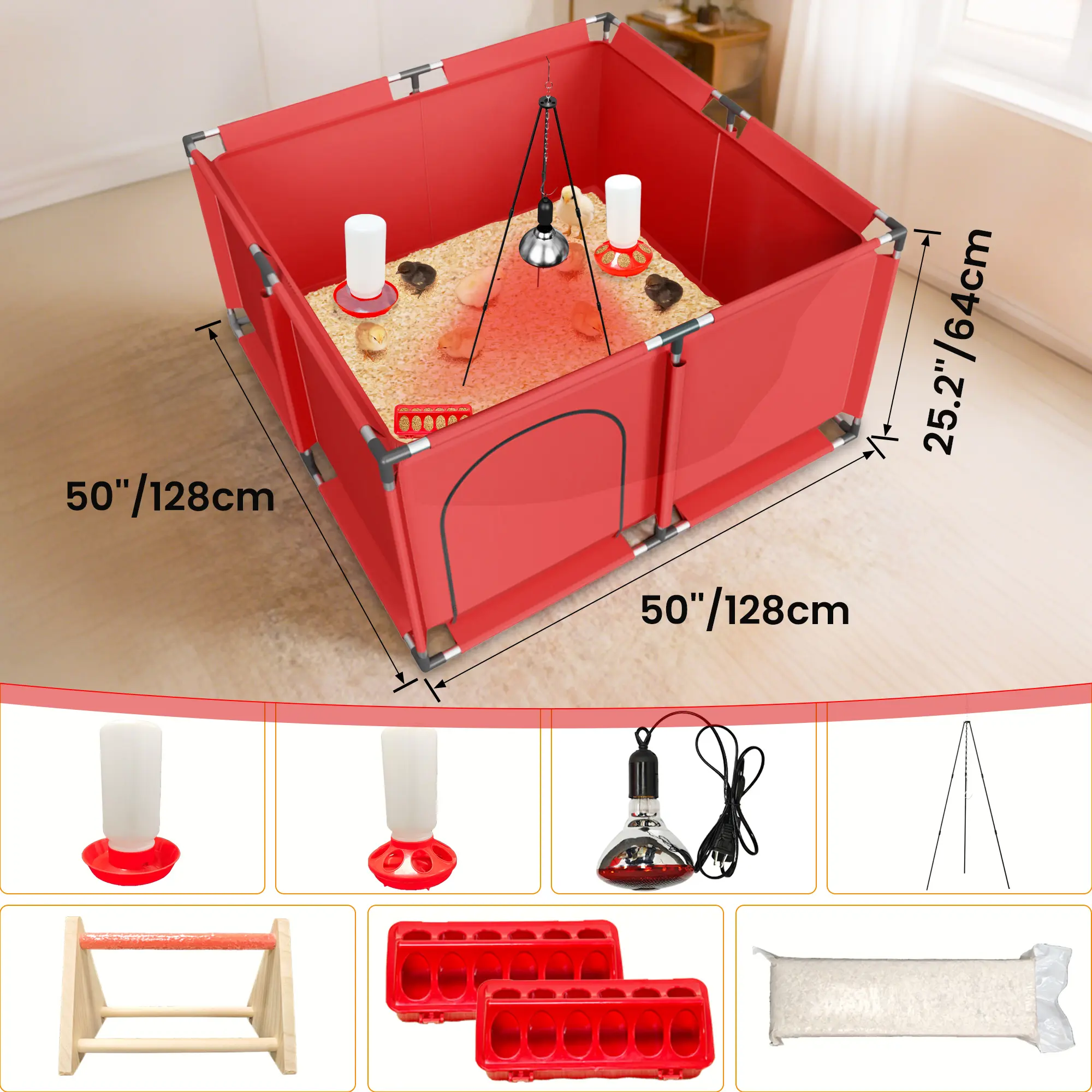 ·【All-in-One Starter Kit】: Brooder pen *1, 250W heating lamp*1, lamp stand*1, chicken feeder & waterer set*1, perch*1, chicken bedding*1. All supplies for living are fully equipped. You can set up a complete brooding environment for chicks.
