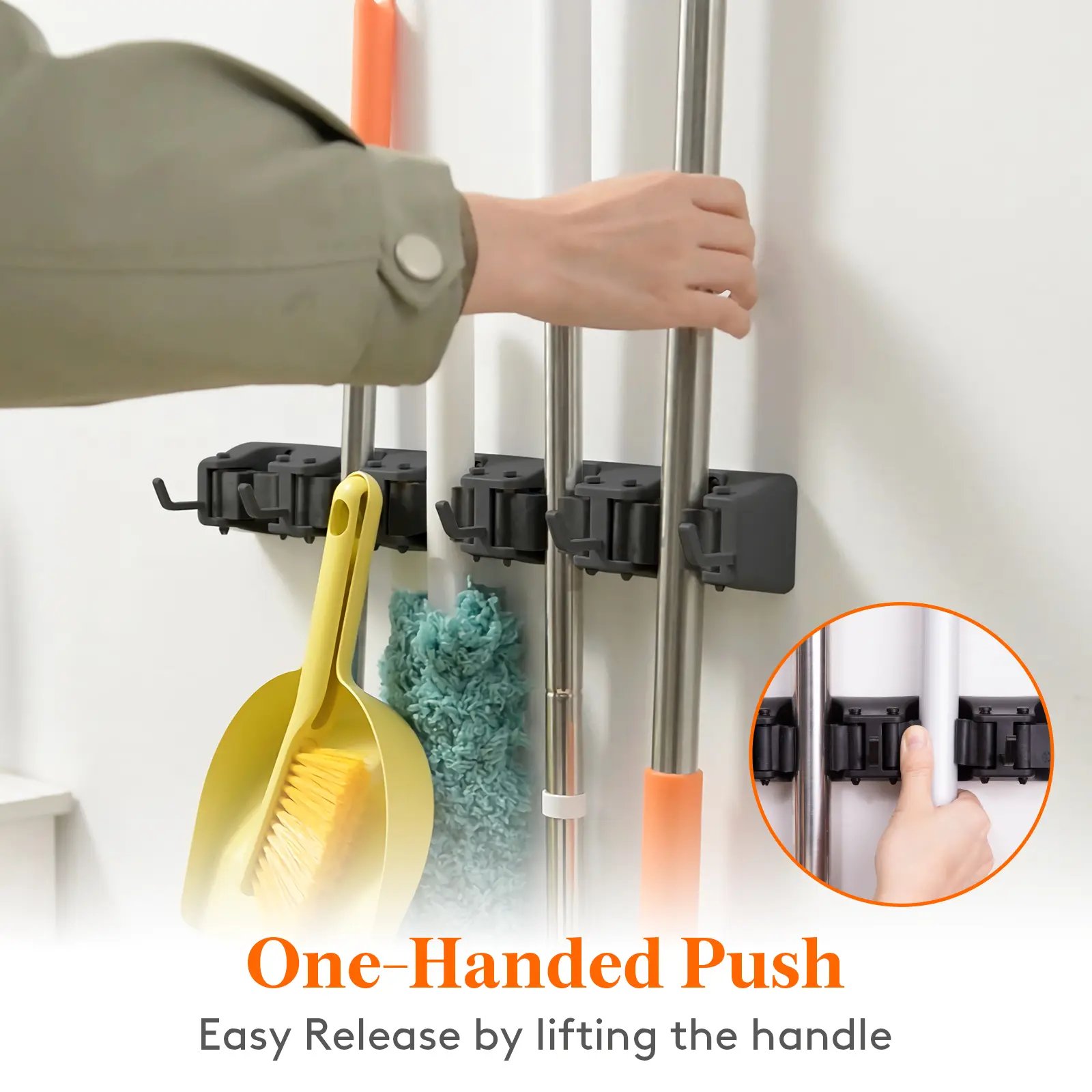 ยทOne-Handed Push: The unique anti-slip pop-up grip lock design makes this broom holder organizer very convenient and quick to use. Only one hand is needed to easily take and put back brooms, mops, dust pans, and other cleaning supplies.