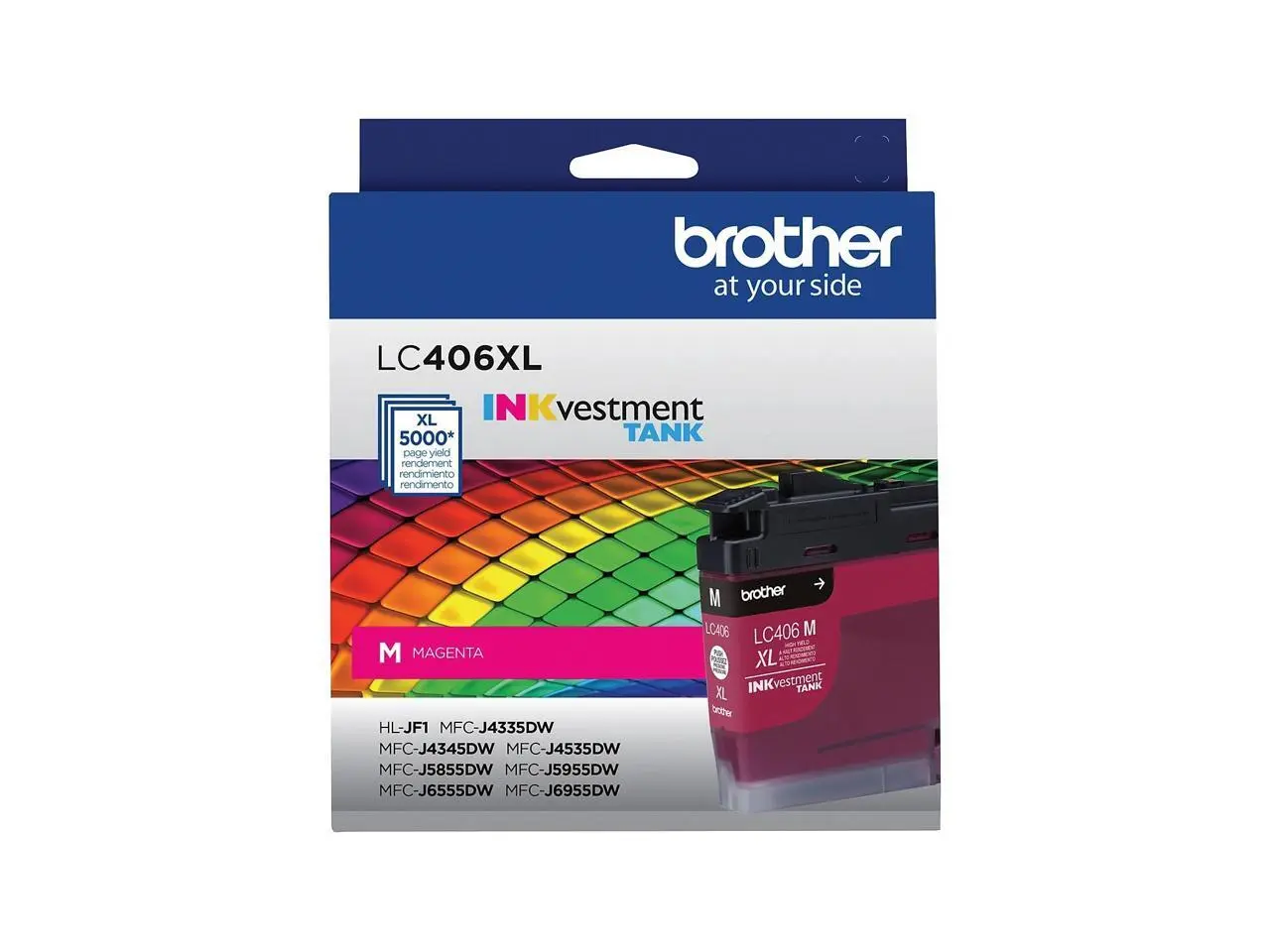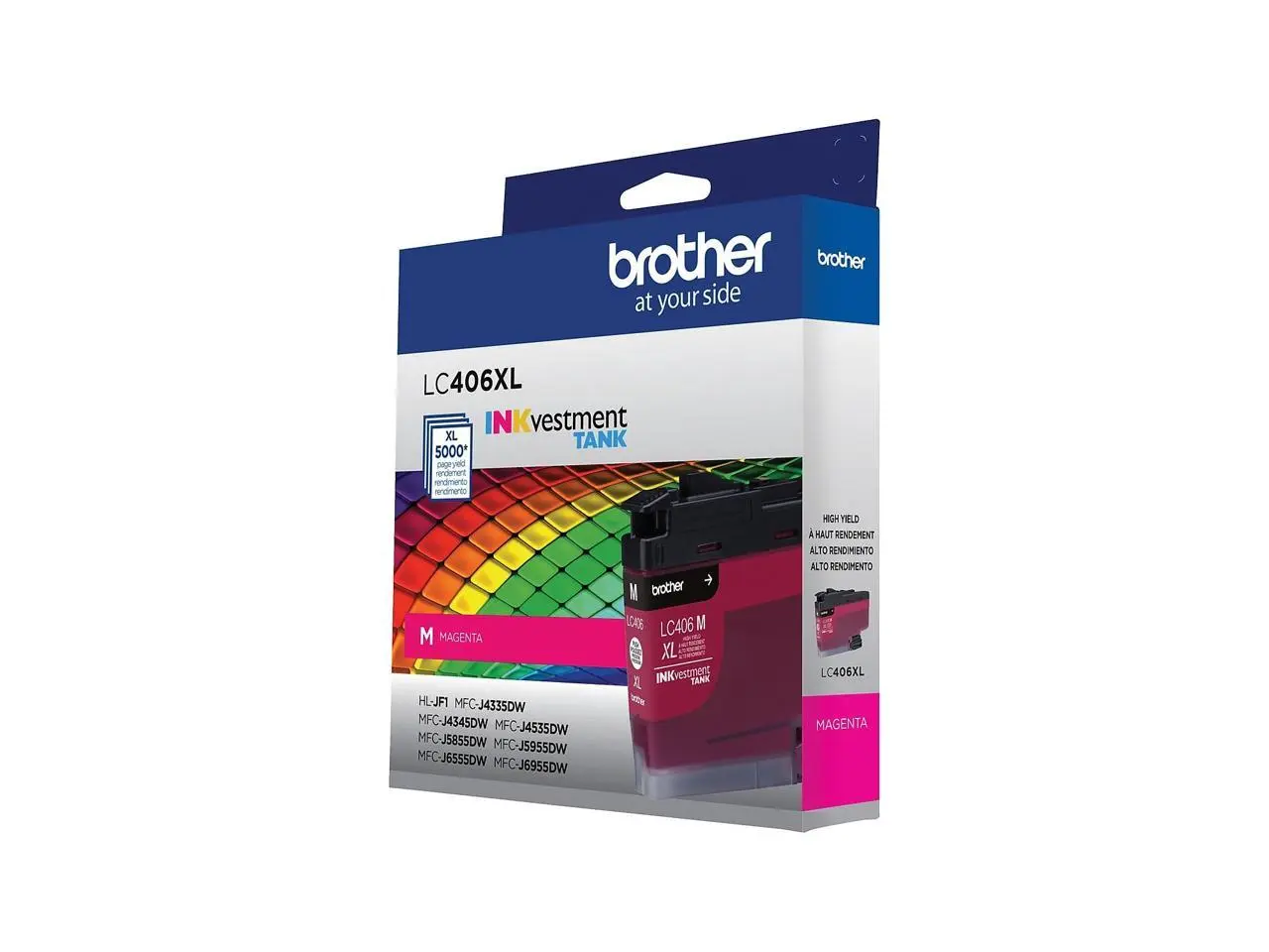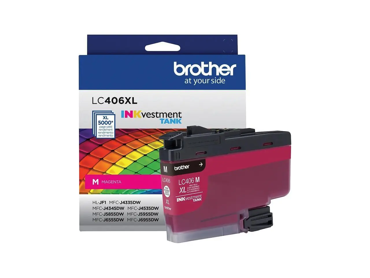 ·INKvestment Tank Ink Cartridge produces high-quality, sharp prints with vivid colors that withstand the test of time. It intelligently engineered to work seamlessly with your Brother INKvestment Tank inkjet printer to deliver outstanding results and reliable performance in your Brother Color Inkjet All-in-One Printers MFC-J4335DW, MFC-J4345DW XL, MFC-J4535DW, MFC-J5855DW, MFC-J5955DW, MFC-J6555DW and MFC-J6955DW. Front-loading ink cartridge continually supplies ink to the internal tank. To refill, simply take out the empty cartridge, plug in a replacement and get back to printing with no waiting and no mess. Enjoy superior inkjet print quality and reliable performance for up to 5,000 pages using this high-yield cartridge. More from the Manufacturer