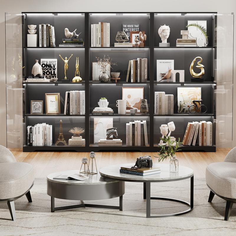 ·【LED LIGHT】Each layer of the display cabinet is equipped with LED lights, which can clearly display your collection, figures, books, trophies, etc. even in the dark. 3 colors lights: white light, warm light, blue light, brightness adjustable. Not only for storage, but also as decoration in your living space.
