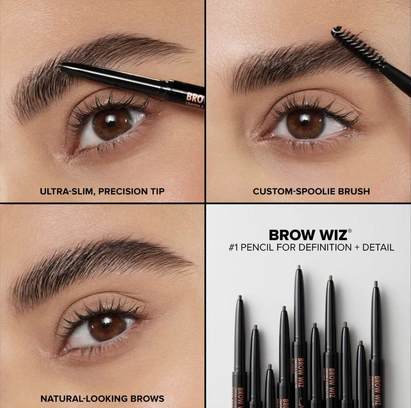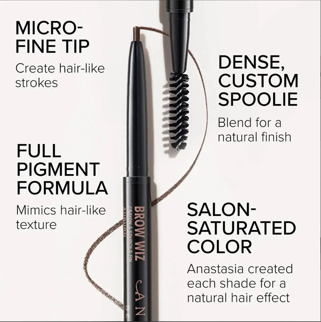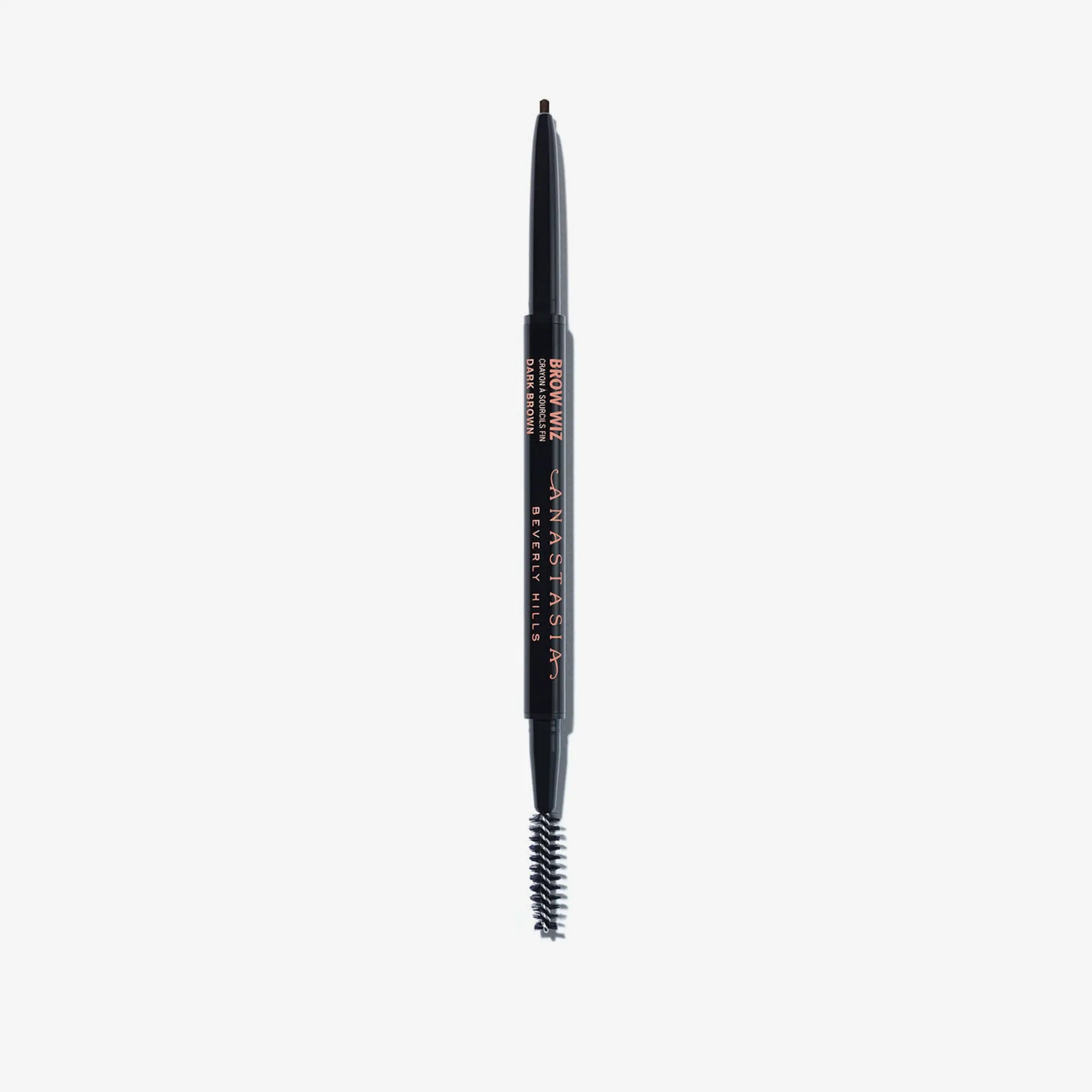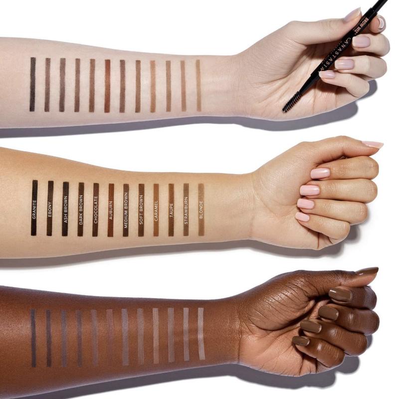 Anastasia Beverly Hills Brow Wiz® is an ultra-slim, retractable eyebrow pencil that is designed to add definition and hair-like detail to the eyebrow with maximum precision and control. Available in 12 shades, the unique wax formula features a perfect blend of eyebrow color and wax to deliver a high color payoff and mimics the look of hair-like texture for a natural-looking eyebrow. The ultra-fine, 1mm tip creates hair-like strokes in sparse areas of the eyebrow, while the custom spoolie brush blends for a natural-looking finish.
