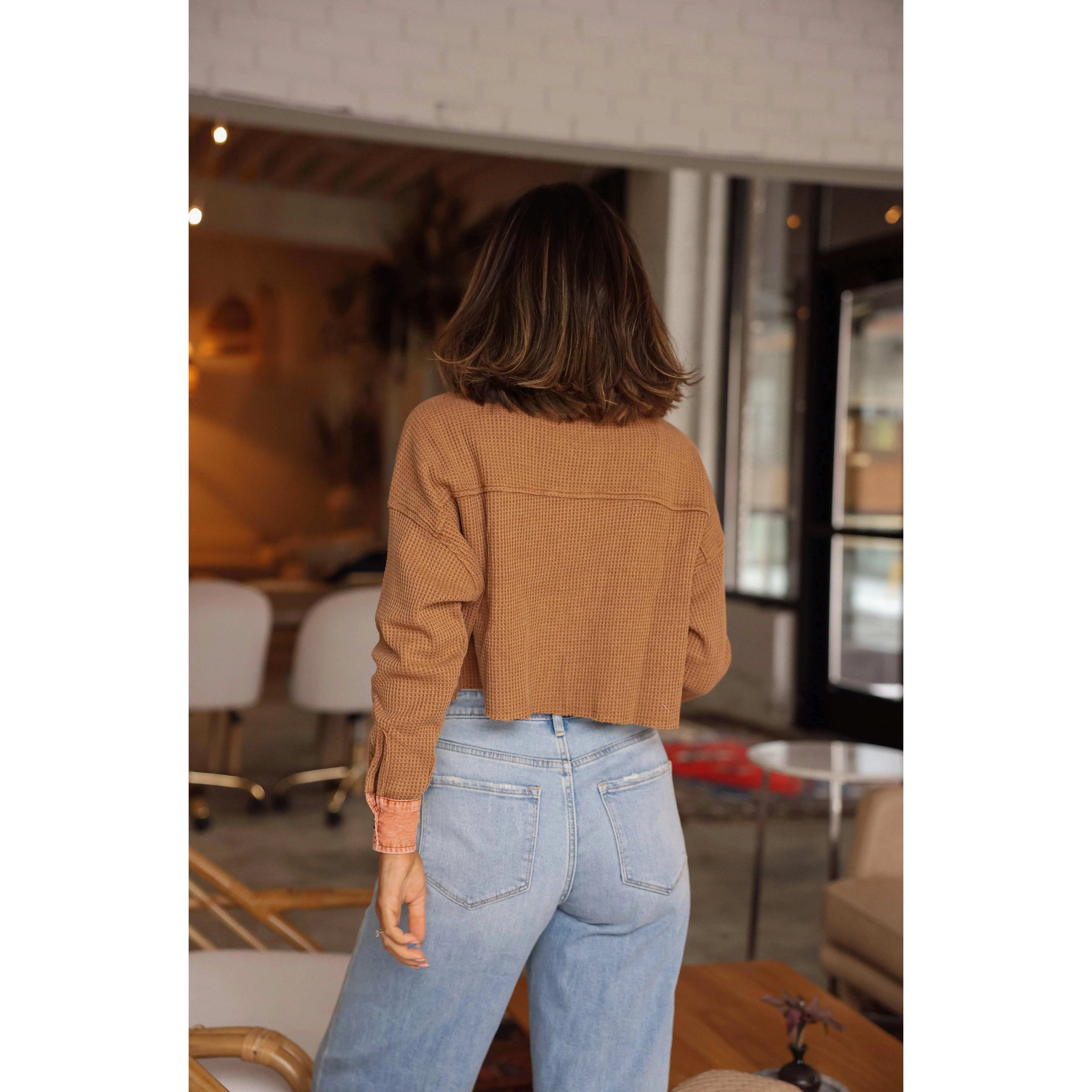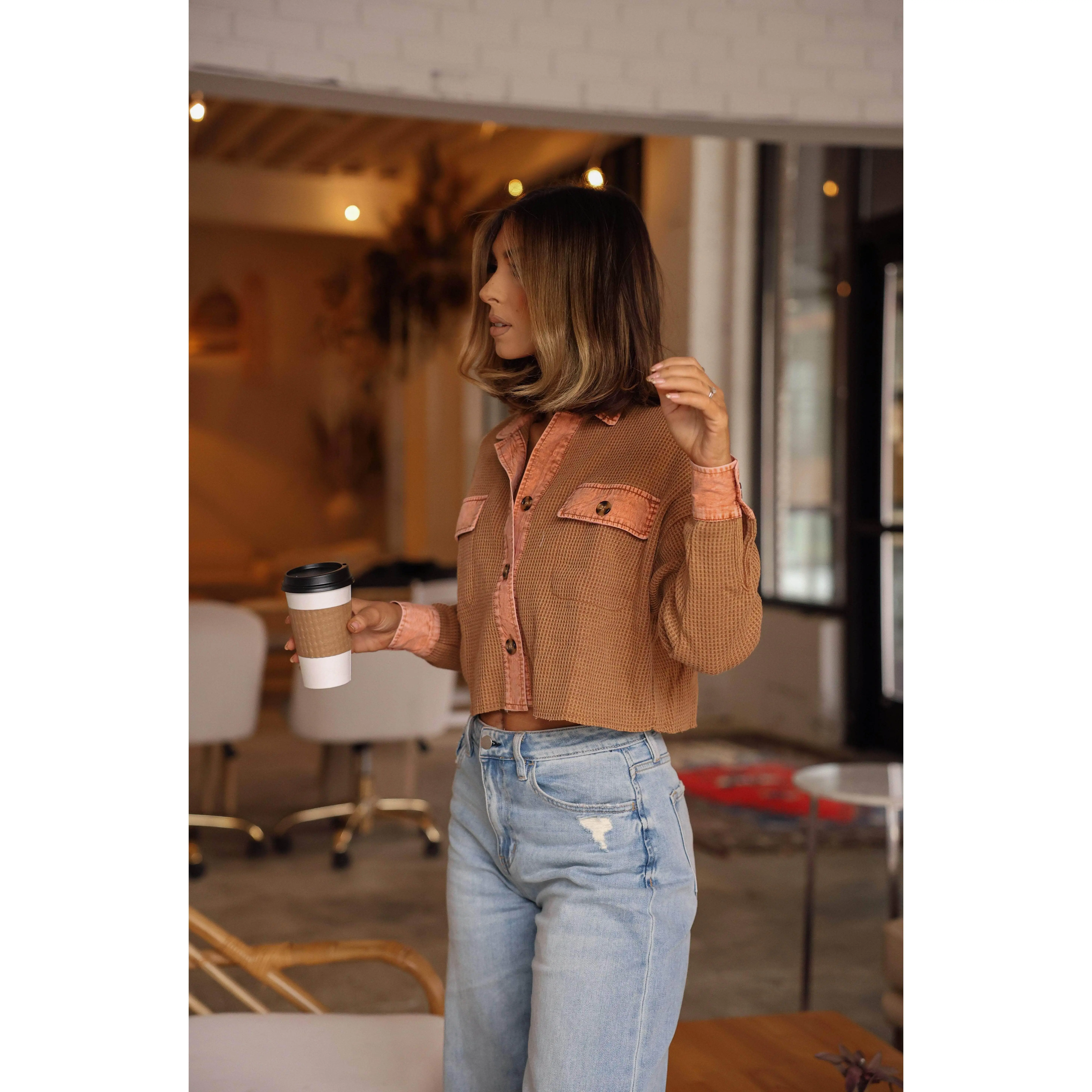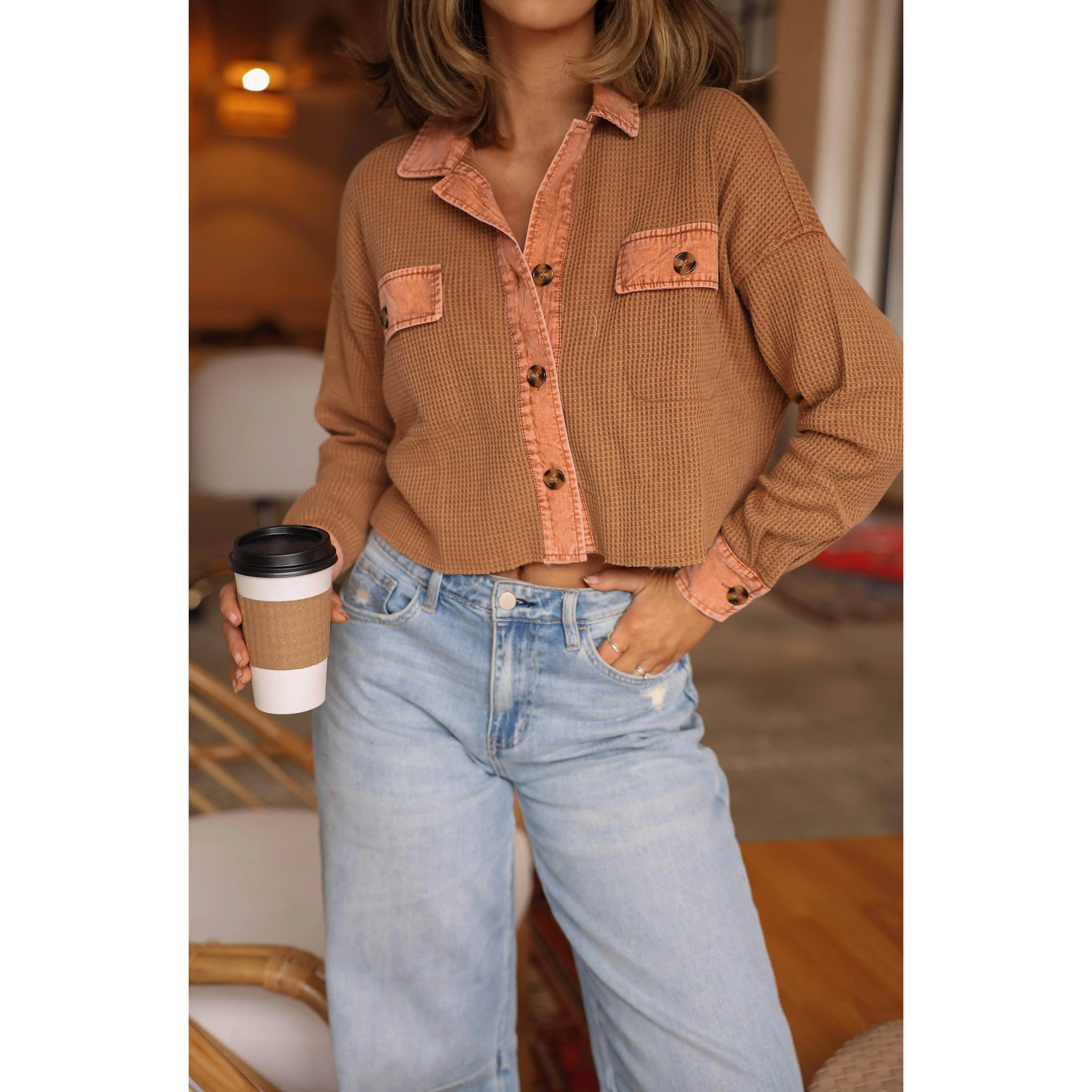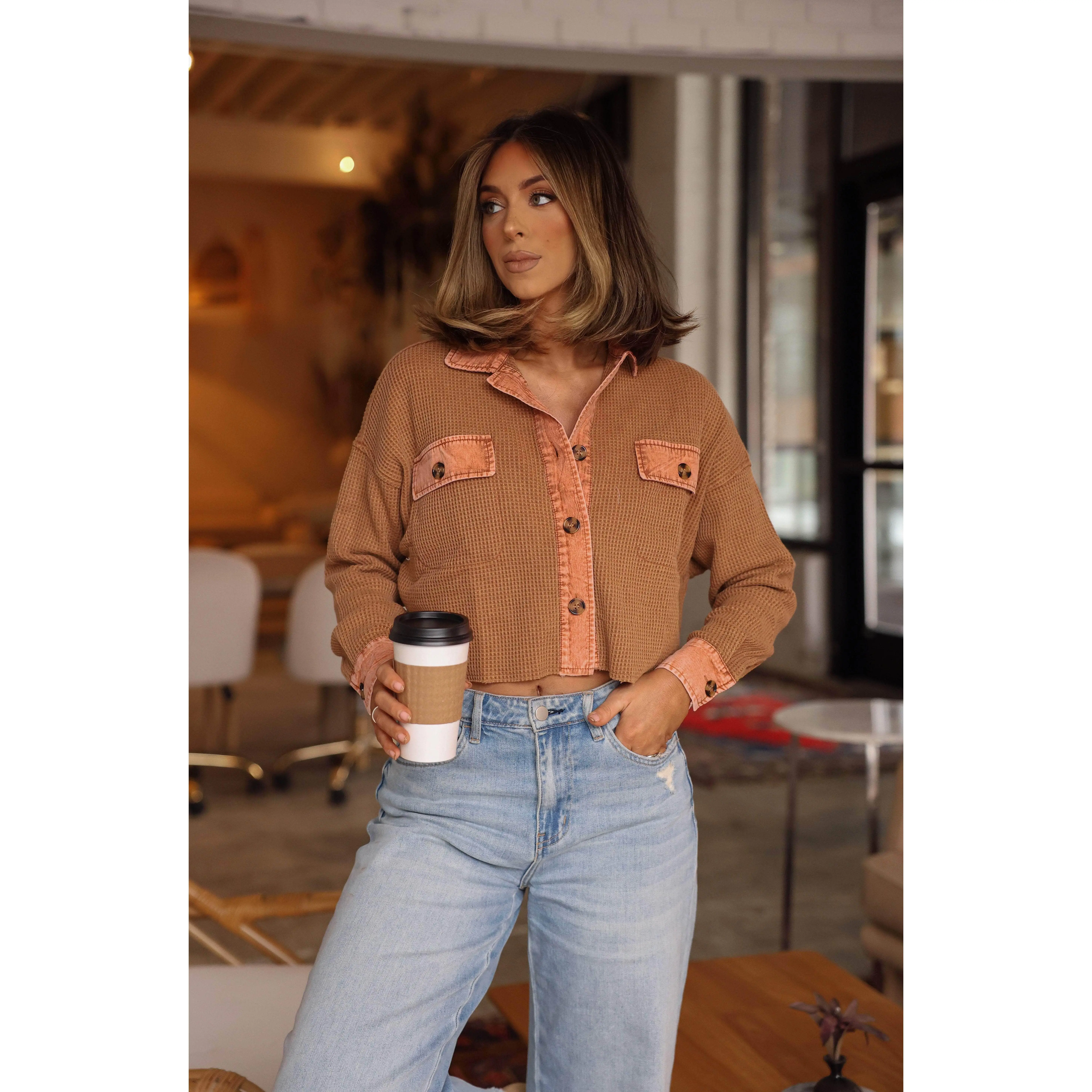Elevate your winter wardrobe with our Brown Waffle Knit Shacket. The collared neckline and button closures exude sophistication, while the waffle knit provides a soft and stretchy feel for ultimate comfort. The relaxed, cropped fit with drop shoulders is perfect for lounging or running errands. Complete with pocket details, this shacket is a versatile and elegant piece for any casual occasion.