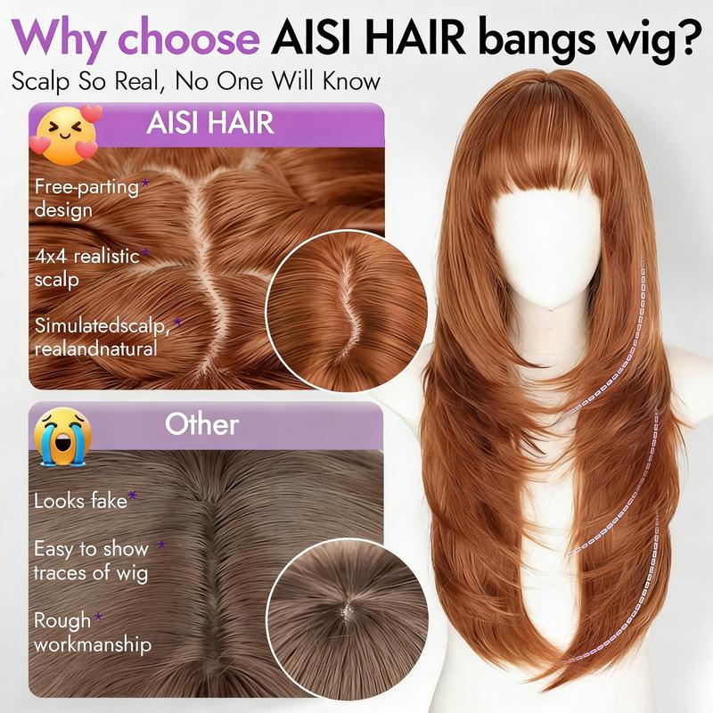 Bangs are way too long. The hair has TOO much volume so it looks fake. It tangles pretty easily but I will say haircut and color are nice.