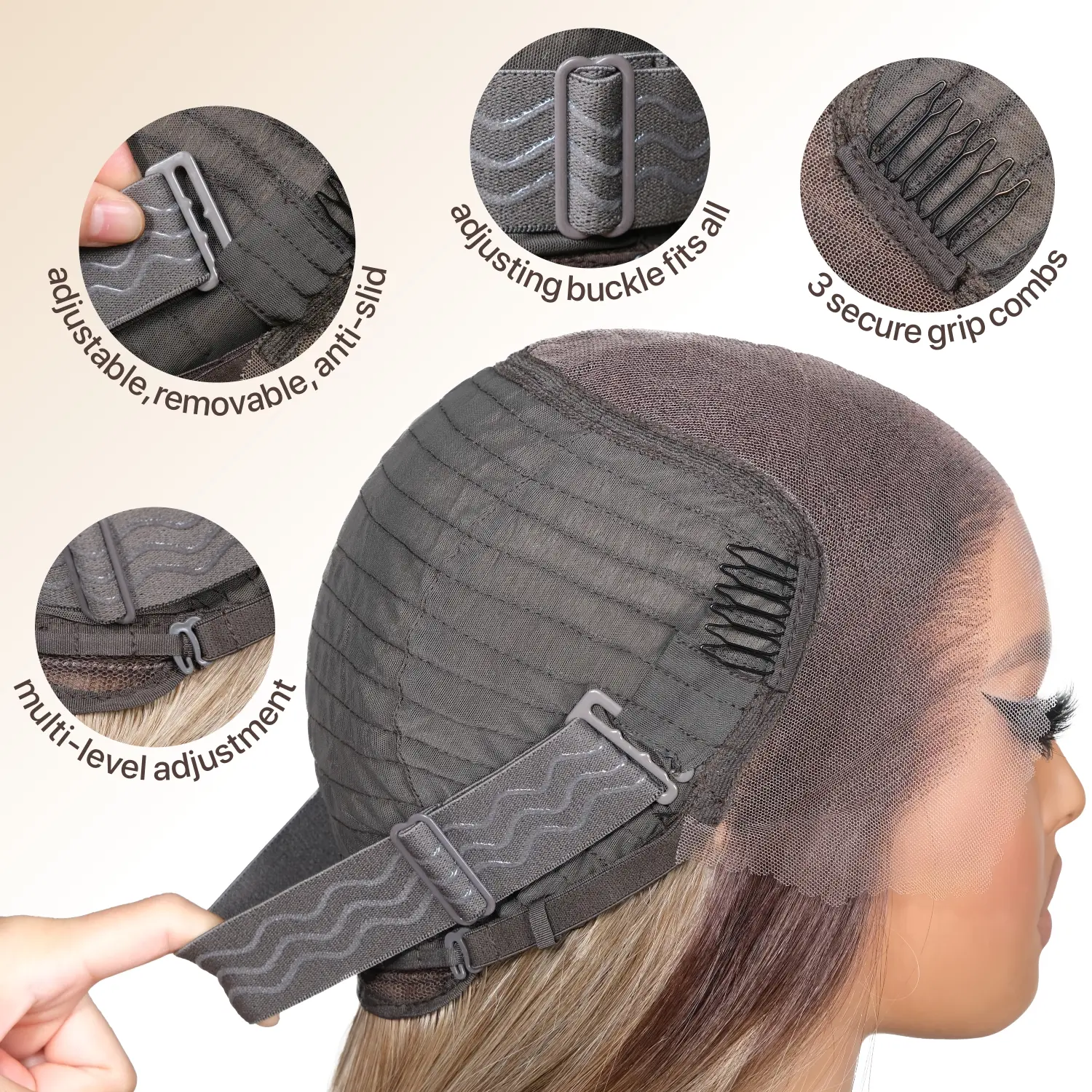 The upgraded glueless lace wig has more layers and a density of 200%~220%, making it more fluffy. It includes 3 combs and adjustable silicone straps. Perfect for dating, parties, cosplay, weddings, travel, or daily use. 🌟