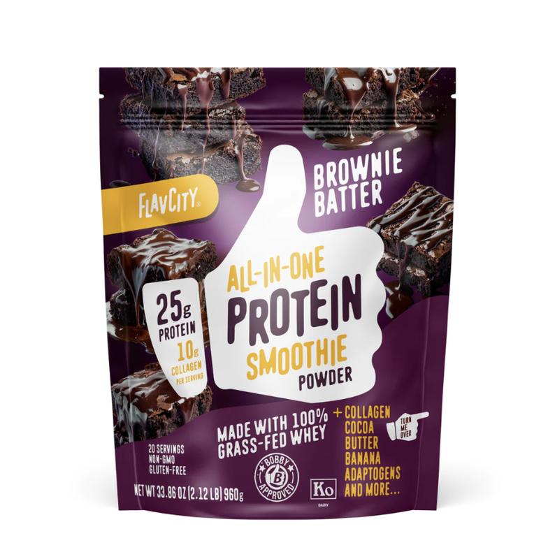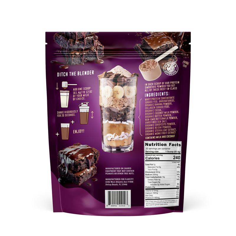 Our Brownie Batter Protein Smoothie tastes like licking the spoon from a fresh batch of brownies made with 100% grass-fed whey. We keep it simple with real ingredients like organic cocoa and organic butter powder to create that deep, decadent brownie flavor. Each serving packs: 25g of protein, 10g of collagen, fruits, and functional mushrooms (cordyceps & reishi). Rather than buying all the ingredients separately, everything you need is now packed into one scoop for only $2.99 per serving. And the best part? No blender needed—just add milk or water, shake, and enjoy.
