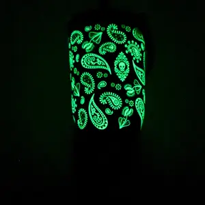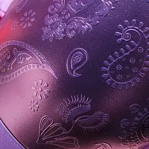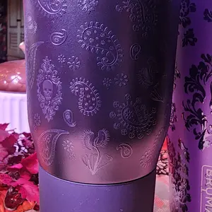 I bought this for me, thinking it would be a little too feminine for my husband. Nope. He tried to claim it as his as soon as I took it out of the box. The black on black is a subtle pattern, but so pretty. Glow isn’t very powerful but I don’t mind. Can and will use even beyond Halloween.