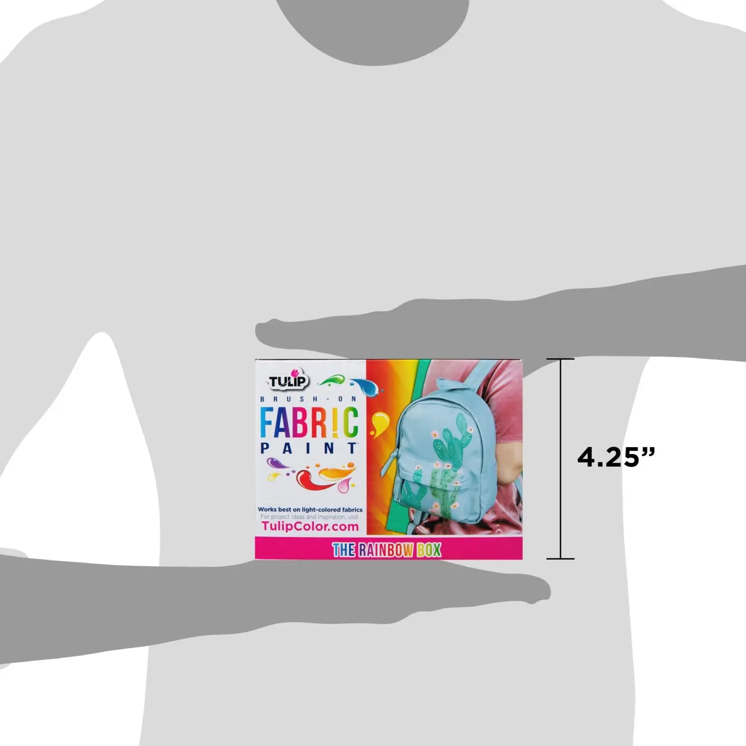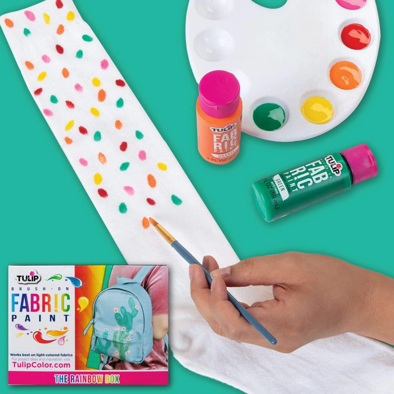 Tulip Brush-On Fabric Paints are formulated exclusively for fabrics, drying with an ultra-soft and flexible bond so they won’t crack or crumble with movement. These nontoxic fabric paints dry permanently with matte and metallic finishes that work best on light-colored fabrics. Tulip Brush-On Fabric Paints can be mixed to create your own custom colors, and can even be watered down to create watercolor effects. The Rainbow Box has all of the essentials for your colorful creations! Includes 14 (2 fl. oz.) Brush-On Fabric Paints in a must-have palette of essential rainbow colors: Pink Lemonade, Red, Orange, Yellow, Primrose, Green, Light Blue, Royal Blue, Periwinkle, Purple, Black, White, Gold Metallic, and Silver Metallic.