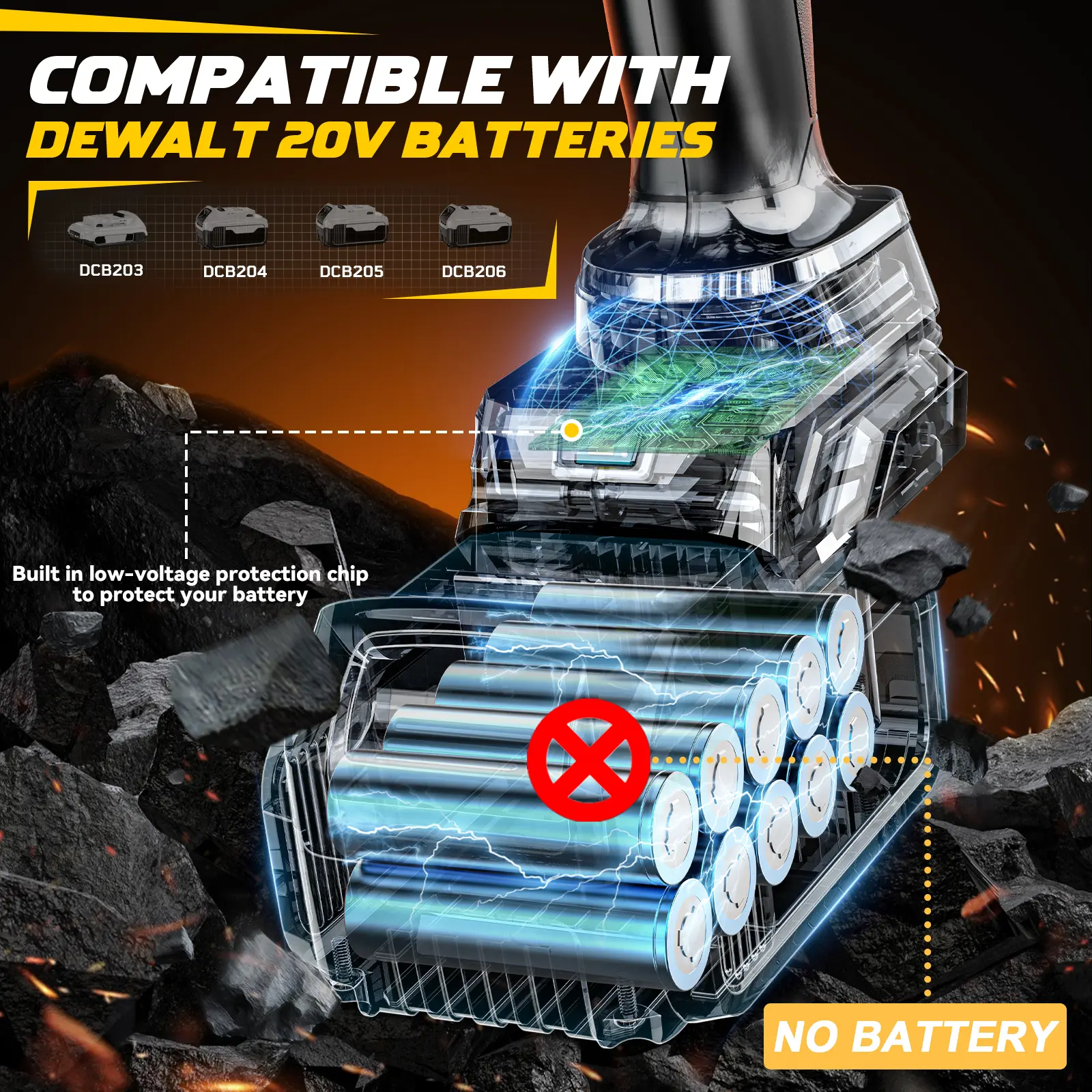 ·BATTERY POWERED IMPACT DRIVER: Our cordless impact wrench is compatible with Dewalt 20V batteries (battery not included), eliminating the need for cords and outlets. The built-in low-voltage protection safeguards both your tool and battery during extended use.