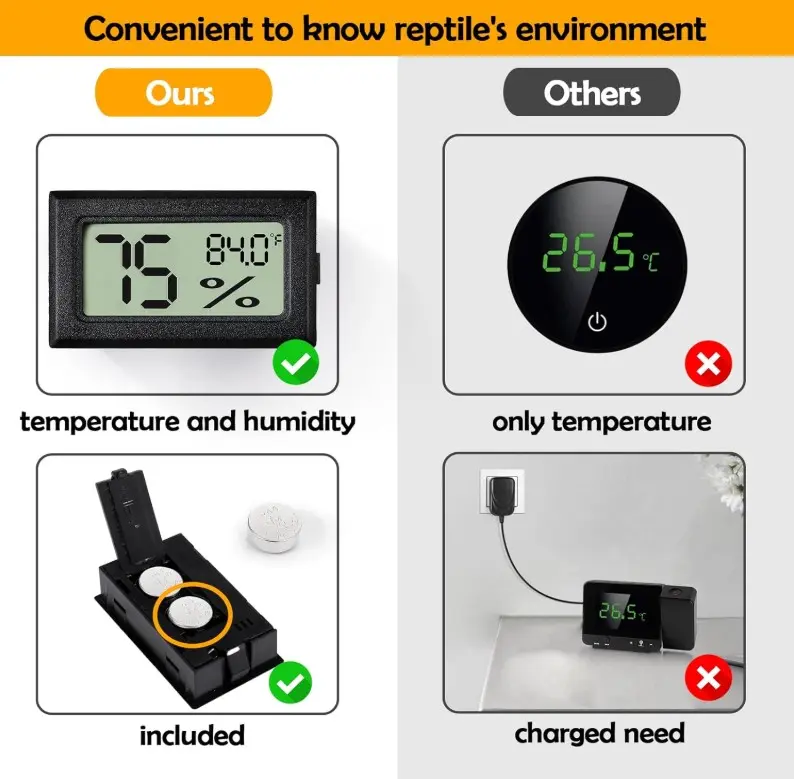 ·Reptile Necessary: Meet the need of Humidity and Temperature measuring for monitoring reptile's living conditions and health. Easily check your pet's living environment. When there are abnormalities, you can timely discovery through reptile thermometer.